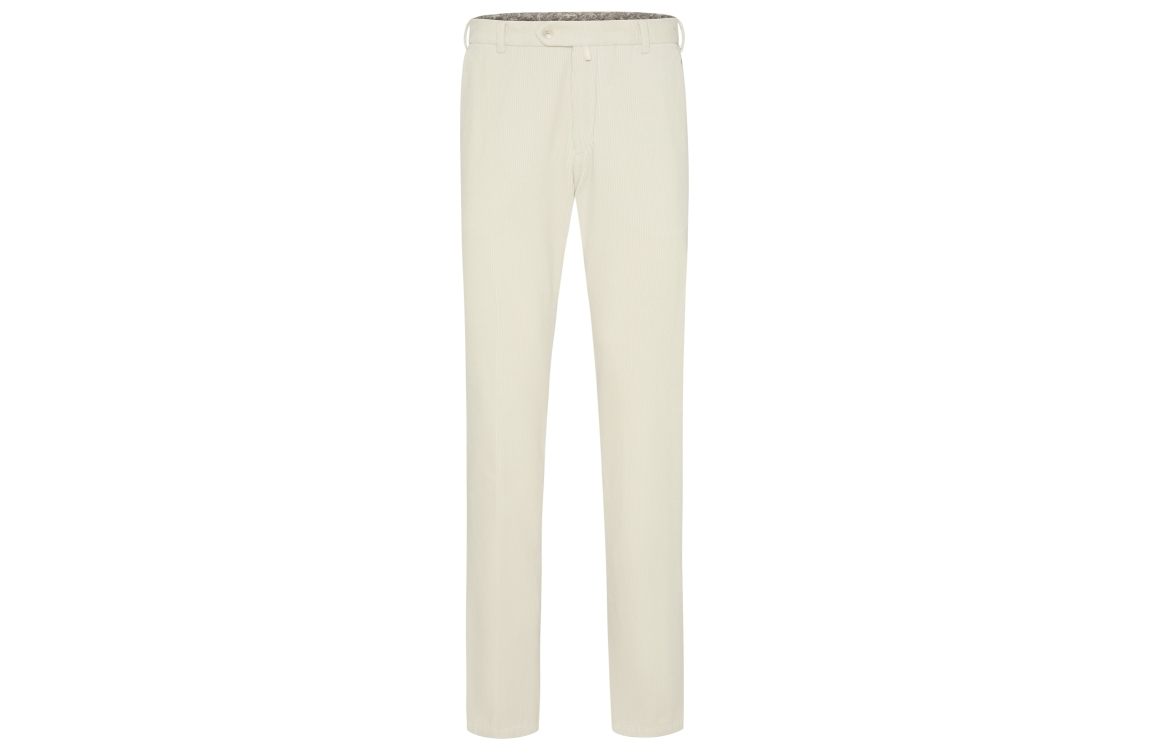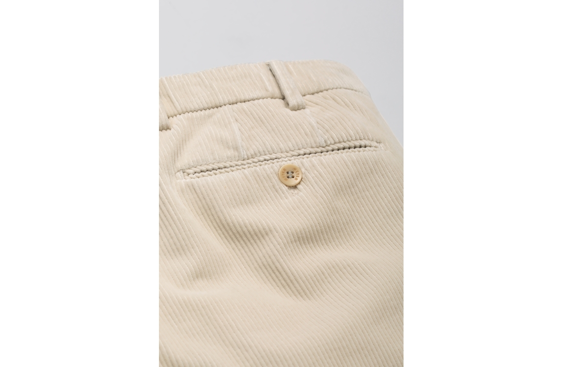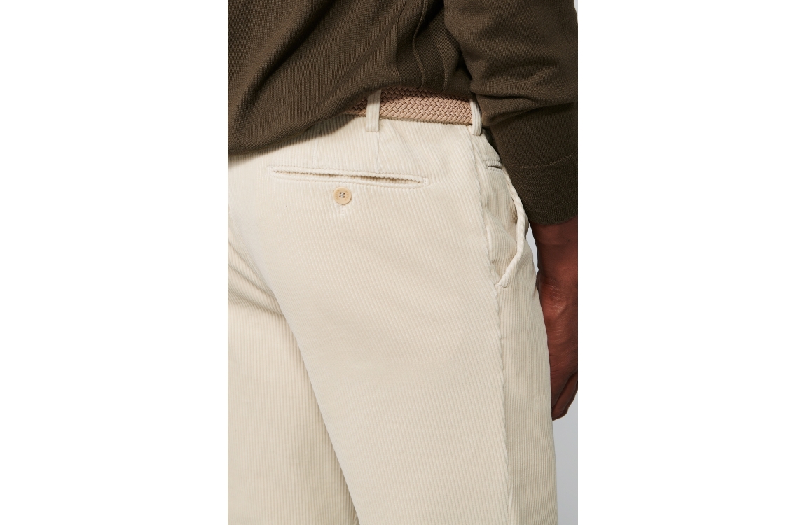 Meyer broek Bonn 1022854900. Dit rechtvallend model is voorzien van ceintuurlussen en heeft twee steek en paspelzakken. Deze beige corduroy broek van Meyer sluit door middel van rits en haakknoop.