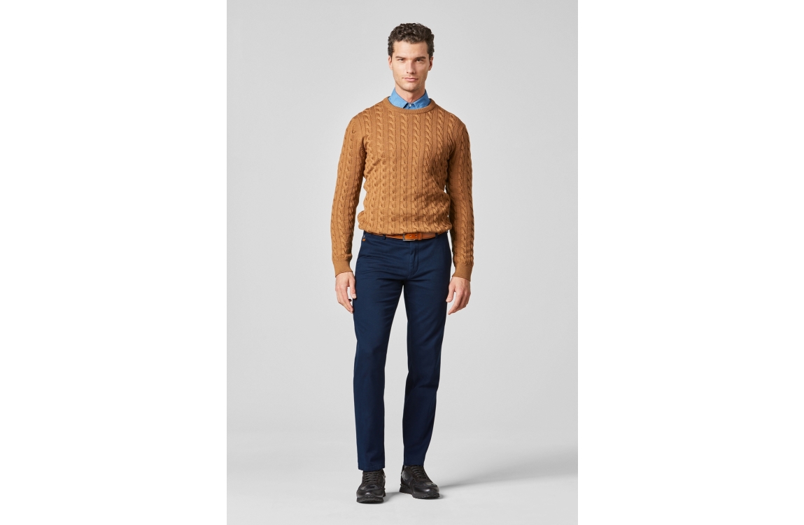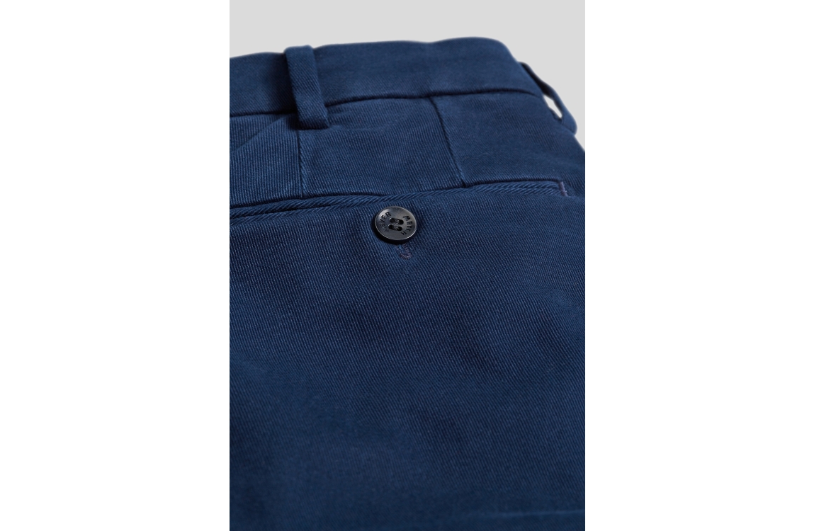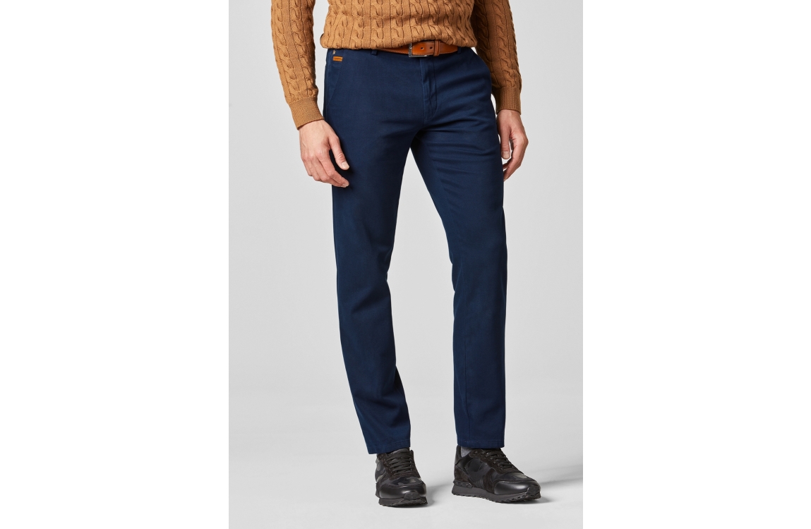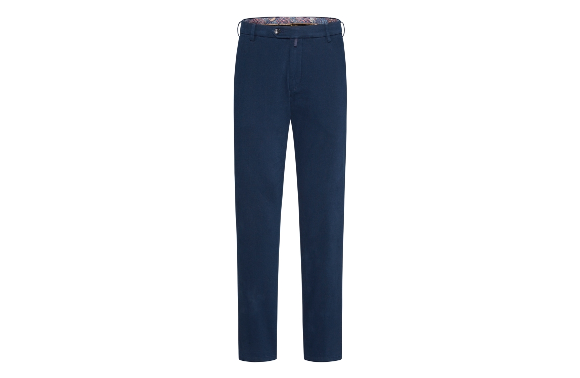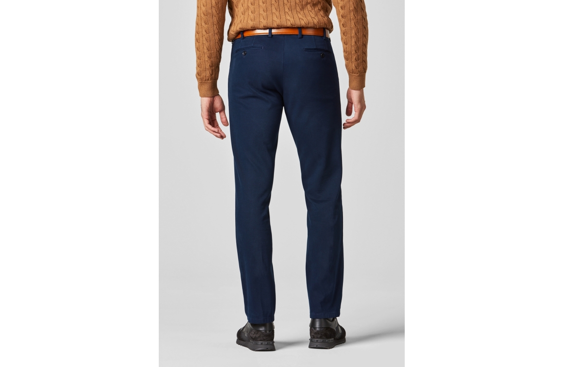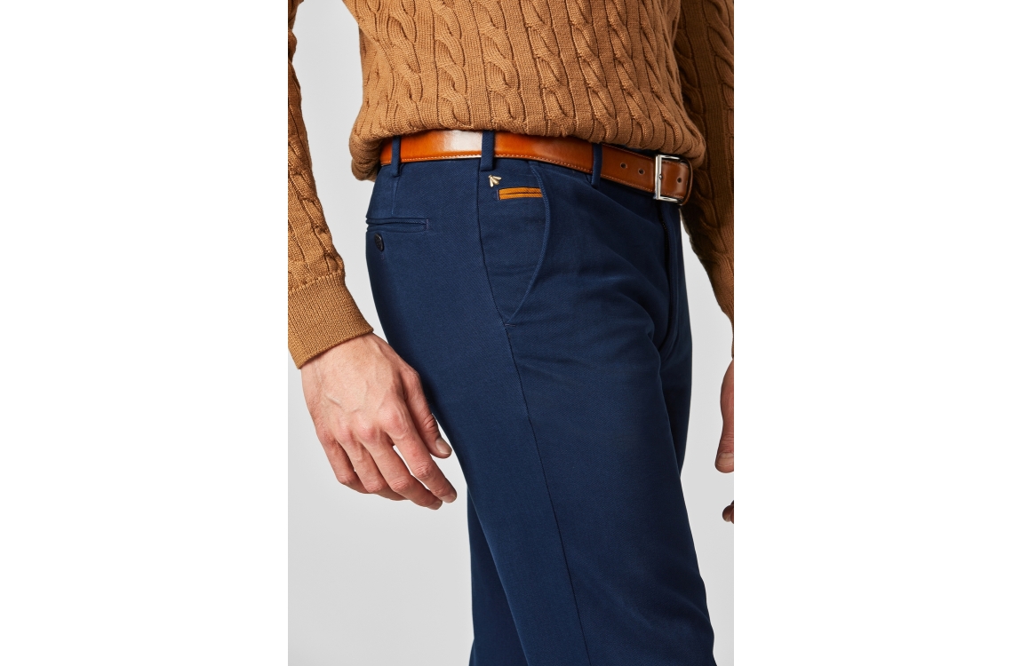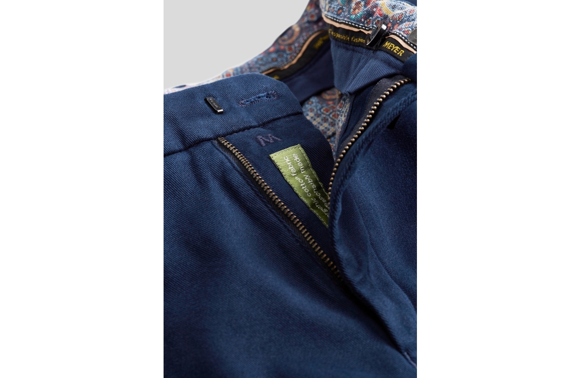 Meyer broek Bonn. Dit regular fit model sluit aan de voorzijde door middel van een knoop en rits. Deze blauwe broek van Meyer is aan de voorzijde voorzien van twee schuine steekzakken en aan de achterzijde voorzien van twee paspelzakken.