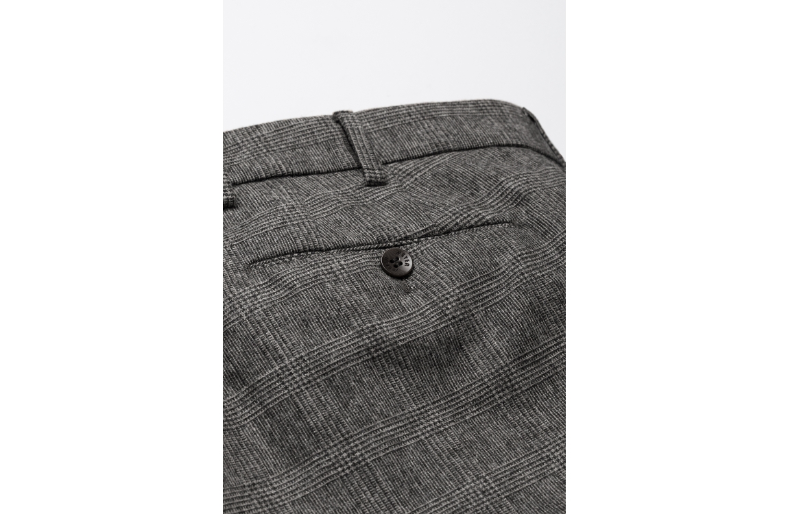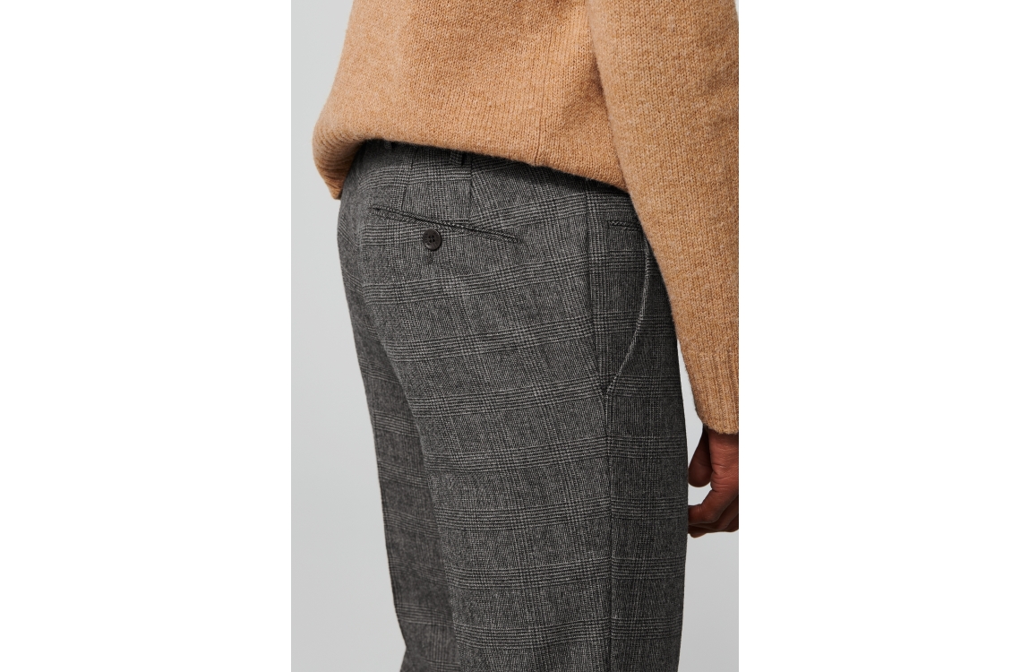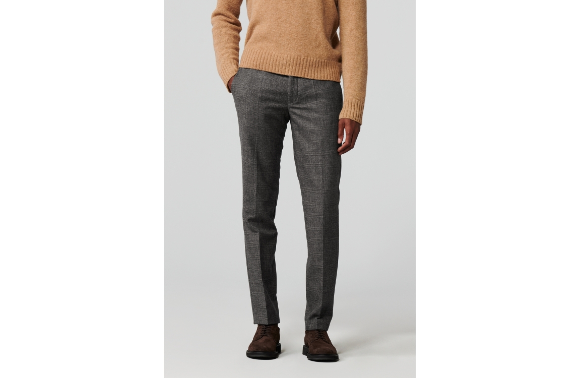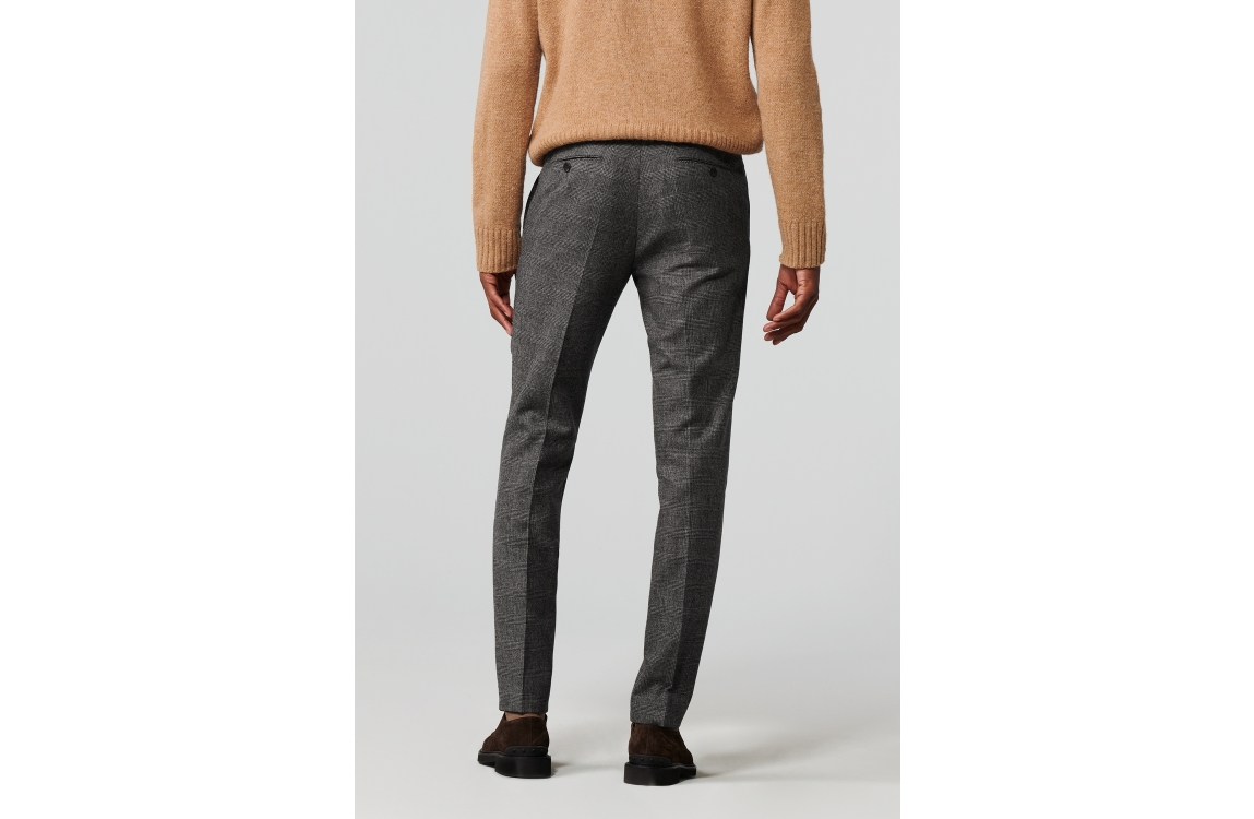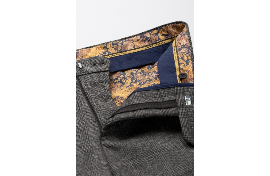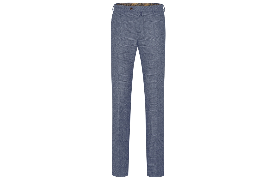 Meyer chino Bonn Art.2-8811. Dit regular fit model sluit aan de voorzijde door middel van een knoop en rits. Deze blauwe broek van Meyer is aan de voorzijde voorzien van twee schuine steekzakken en aan de achterzijde voorzien van twee paspelzakken en heeft een geruit patroon.