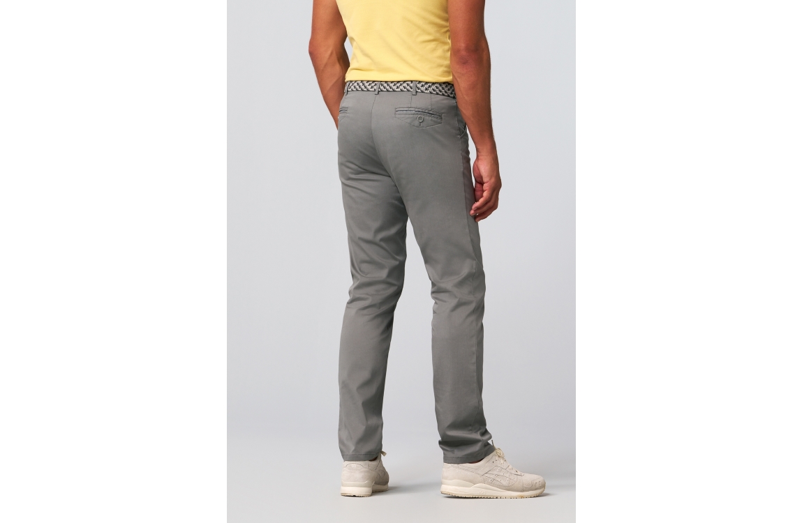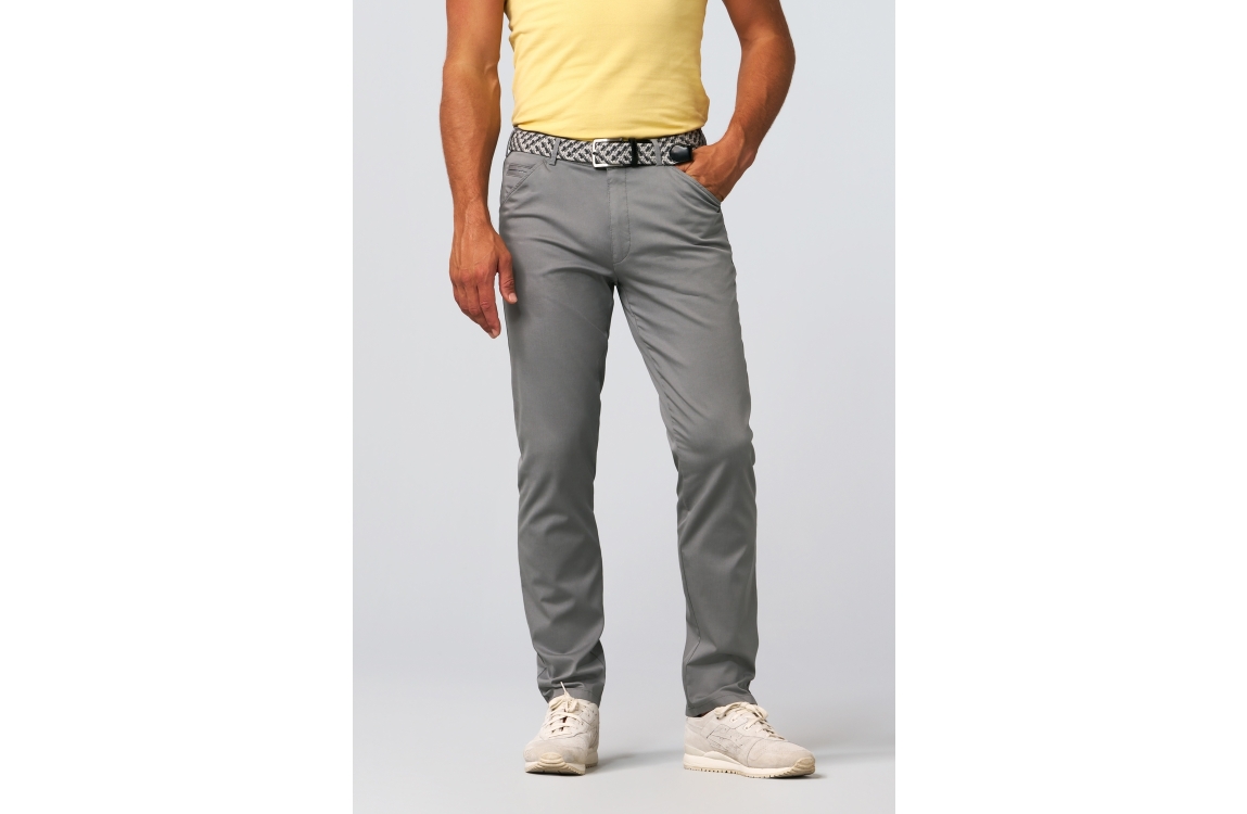 Meyer broek Chicago 3321506000. Dit rechtvallend model is voorzien van ceintuurlussen en heeft twee steekzakken en paspelzakken, deze grijze broek van Meyer sluit door middel van rits en knoop.