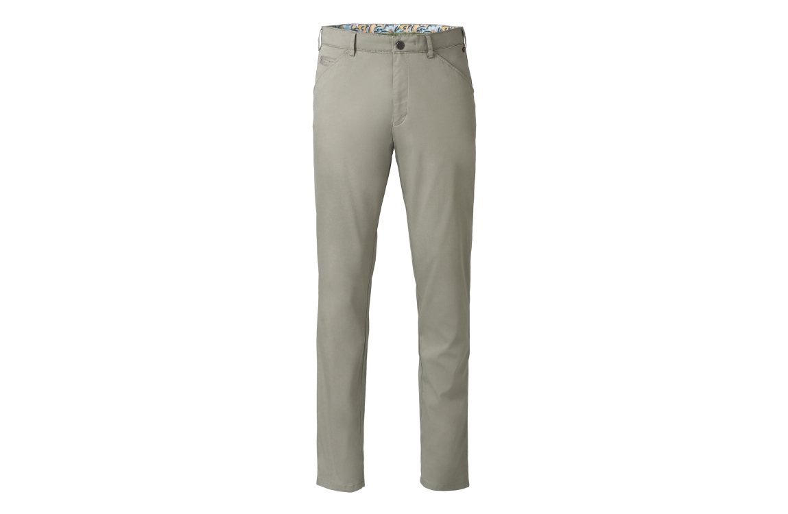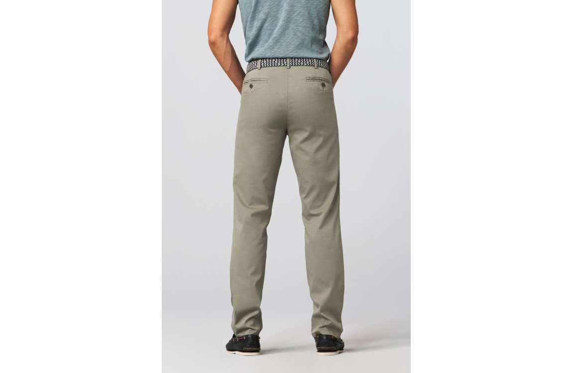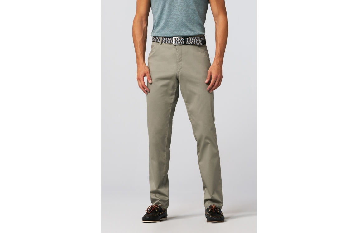 Meyer broek Chicago 3321506000. Dit rechtvallend model is voorzien van ceintuurlussen en heeft twee steekzakken en paspelzakken, deze groene broek van Meyer sluit door middel van rits en knoop.