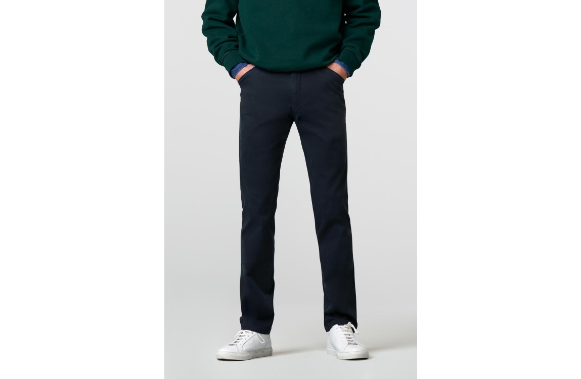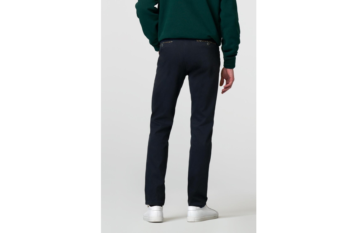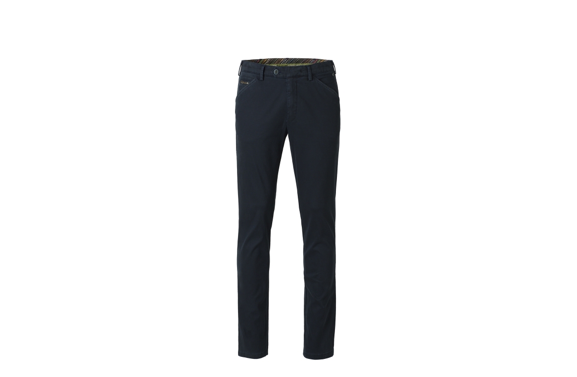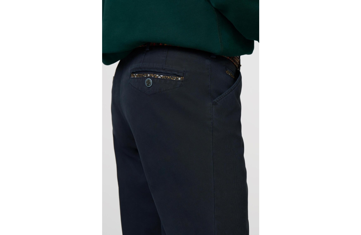 Meyer broek Chicago. Dit regular fit sluit aan de voorzijde door middel van een knoop en rits. Deze donkerblauwe broek van Meyer is aan de voorzijde voorzien van twee schuine steekzakken en aan de achterzijde voorzien van twee paspelzakken.