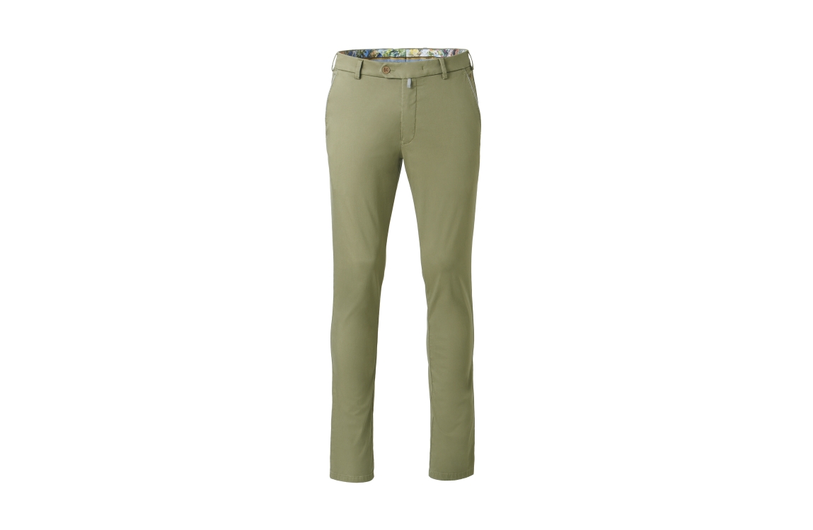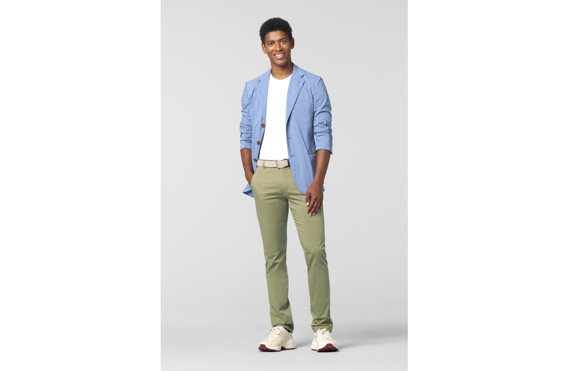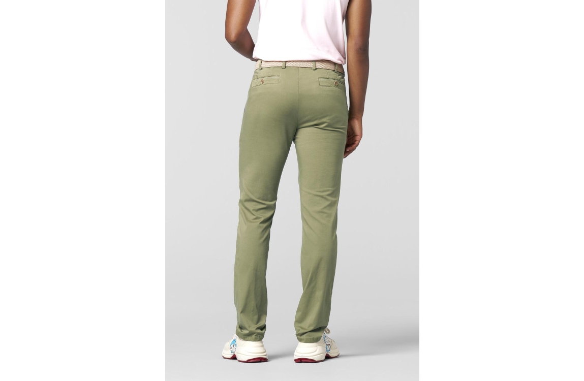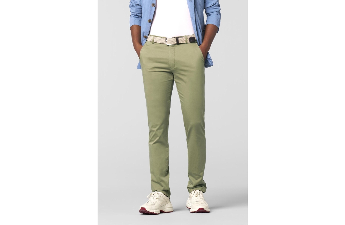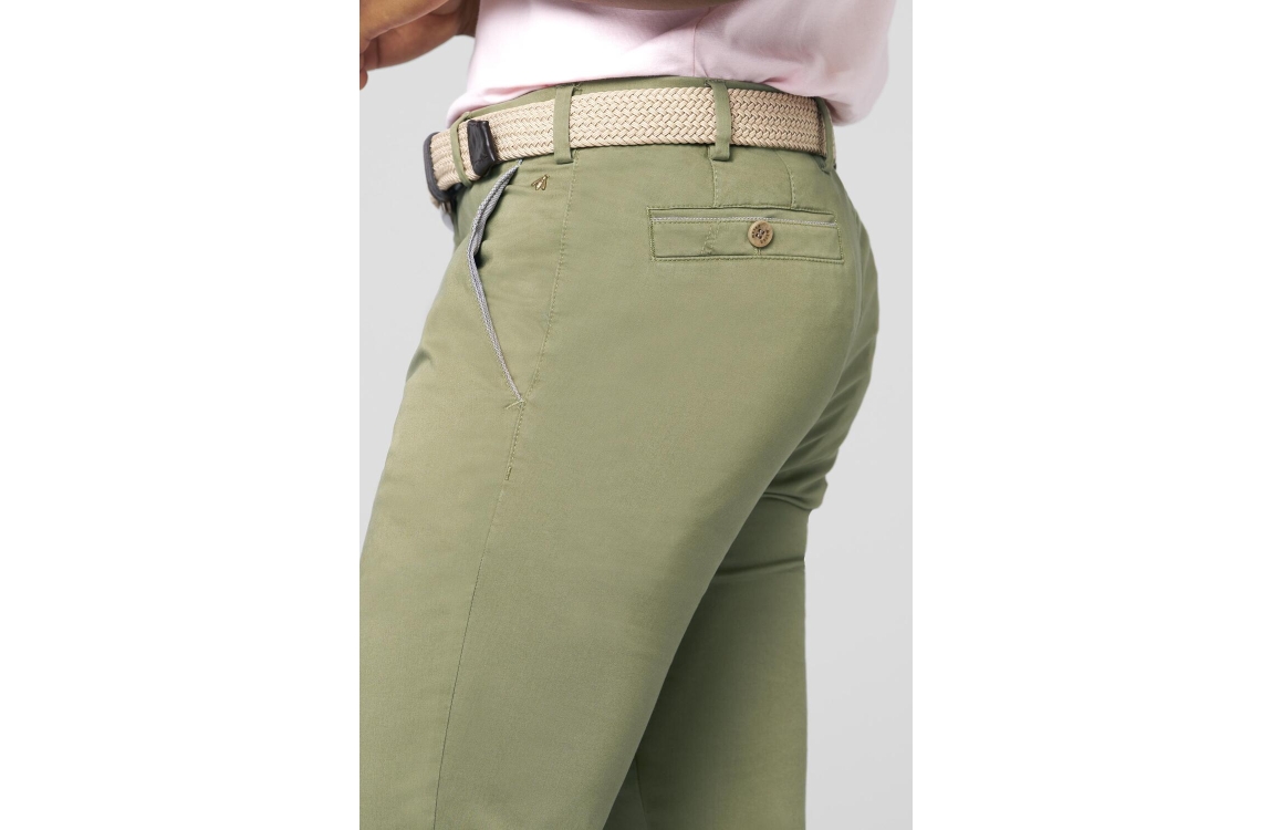 Meyer broek New York 241813000. Dit rechtvallend model is voorzien van ceintuurlussen en heeft twee steekzakken en paspelzakken. Deze groene broek van Meyer sluit door middel van rits en knoop.