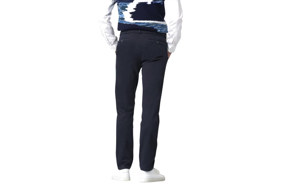 Meyer broek New York 241813000. Dit rechtvallend model is voorzien van ceintuurlussen en heeft twee steekzakken en paspelzakken. Deze blauwe broek van Meyer sluit door middel van rits en knoop.