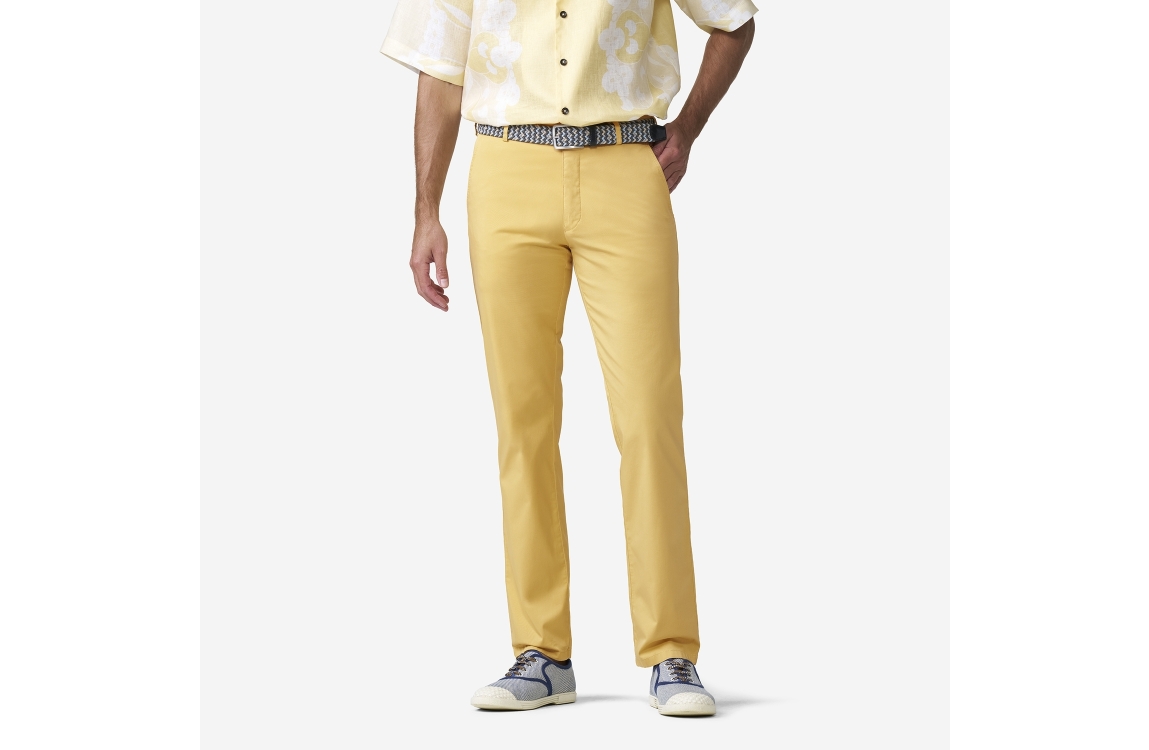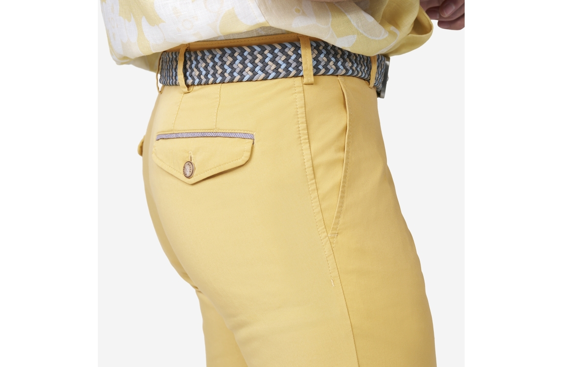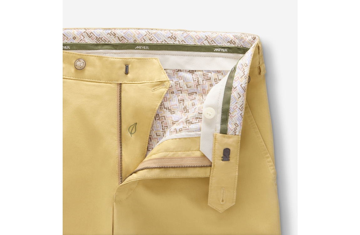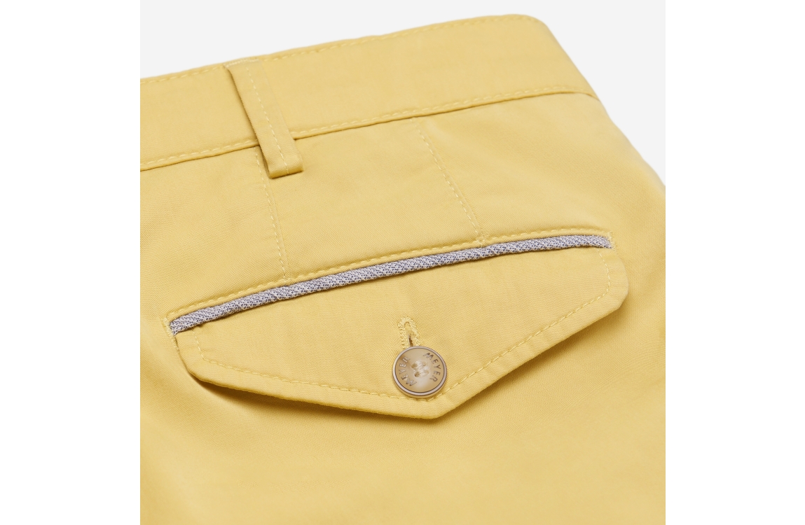 Meyer Paris broek 3361507300. Dit regular fit model sluit aan de voorzijde door middel van een knoop en rits. Deze gele broek van Meyer is aan de voorzijde voorzien van twee schuine steekzakken en aan de achterzijde voorzien van twee paspelzakken.