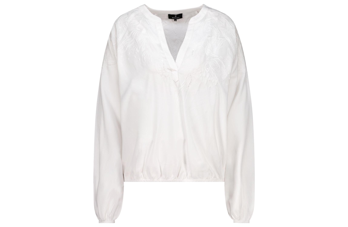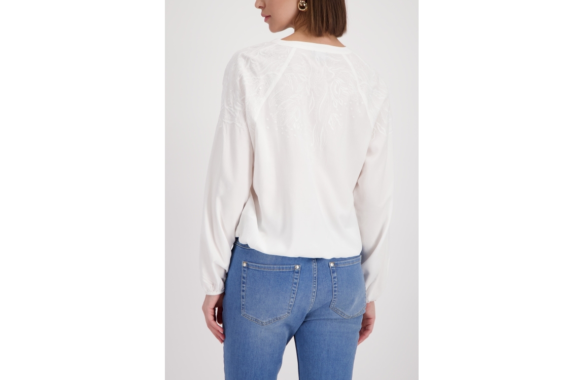 Monari Bluse 102 Off white. Dit rechtvallende model is voorzien van een v-hals en heeft lange mouwen. Deze off-white blouse van Monari is afgewerkt met elastische boorden en bewerkt met een borduursel.