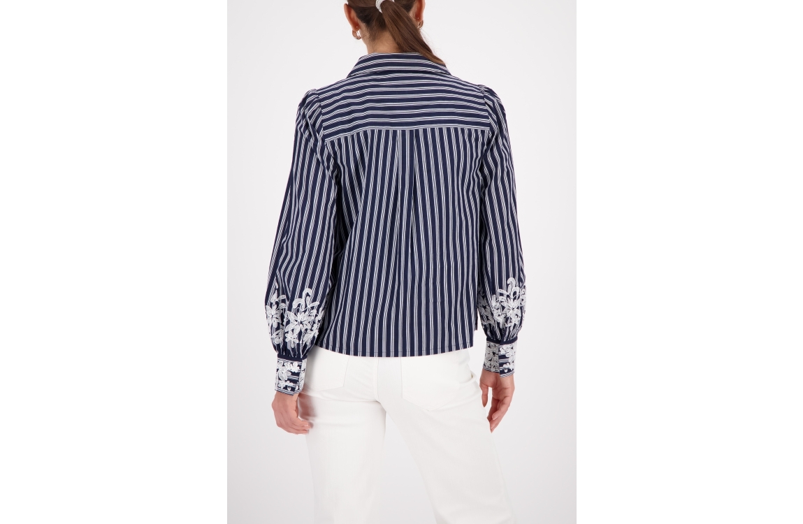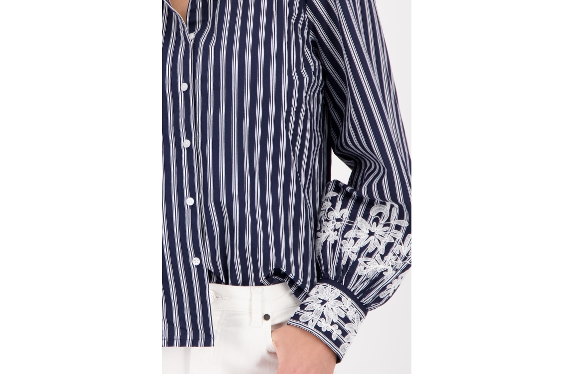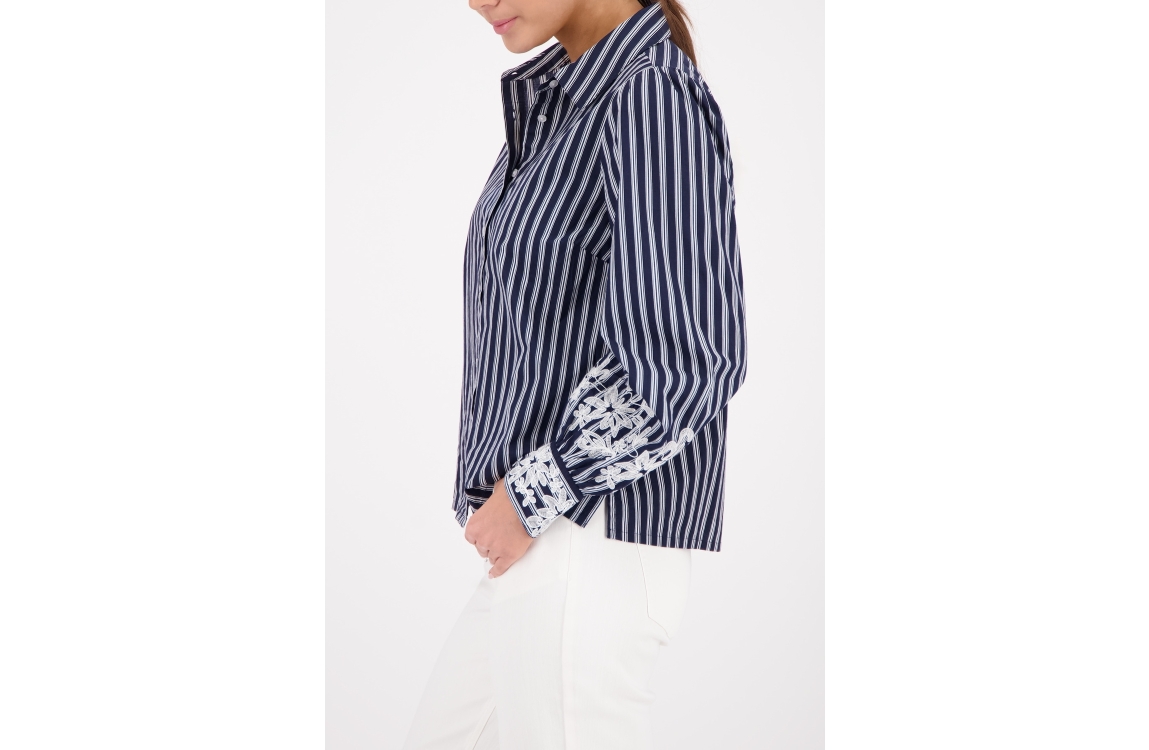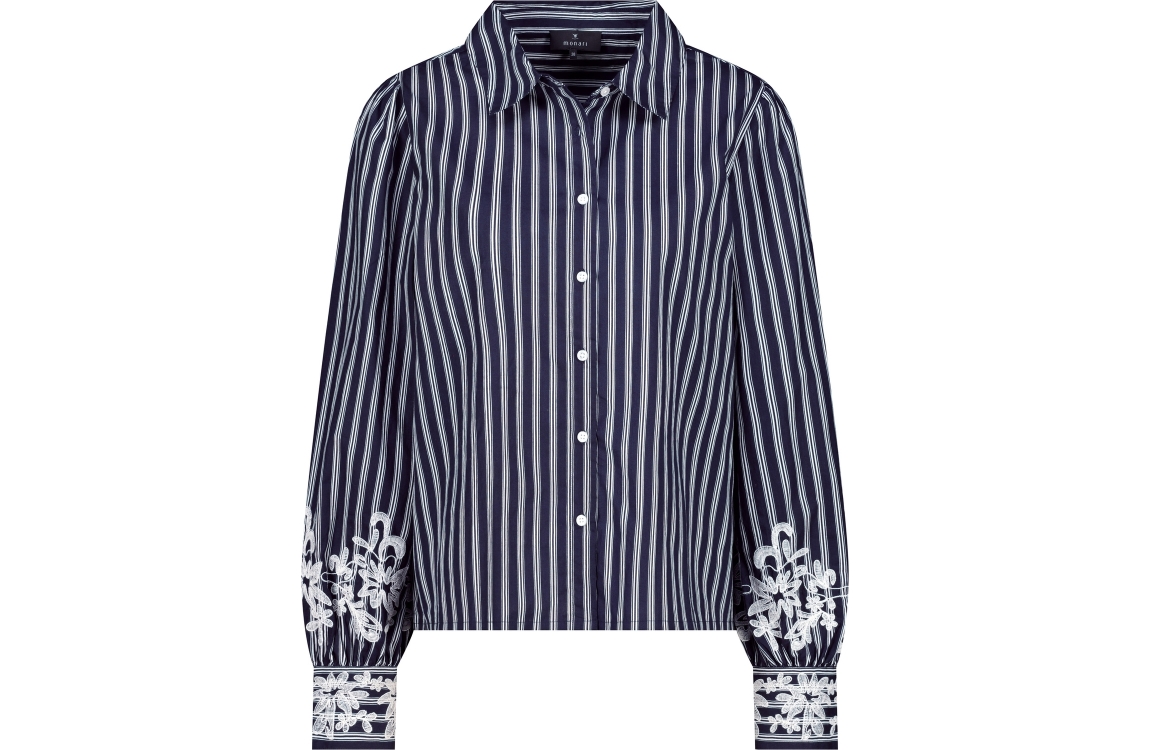 Monari blouse 410344. Dit rechtvallend model heeft een kraag, lange mouwen en sluit door middel van knopen. Deze donkerblauwe blouse van Monari is bewerkt met verticale strepen en een bloemen detail aan de onderzijde van de mouwen.