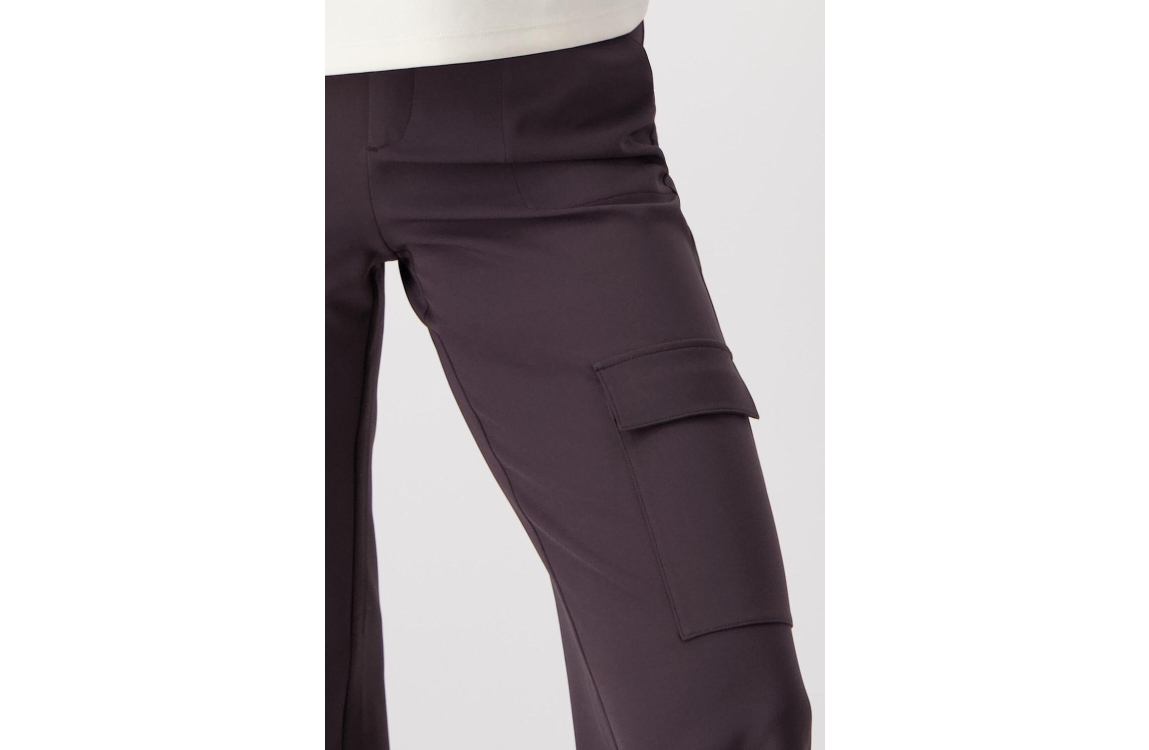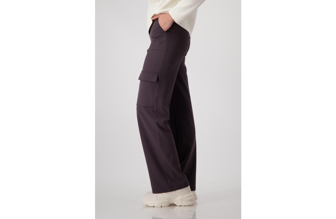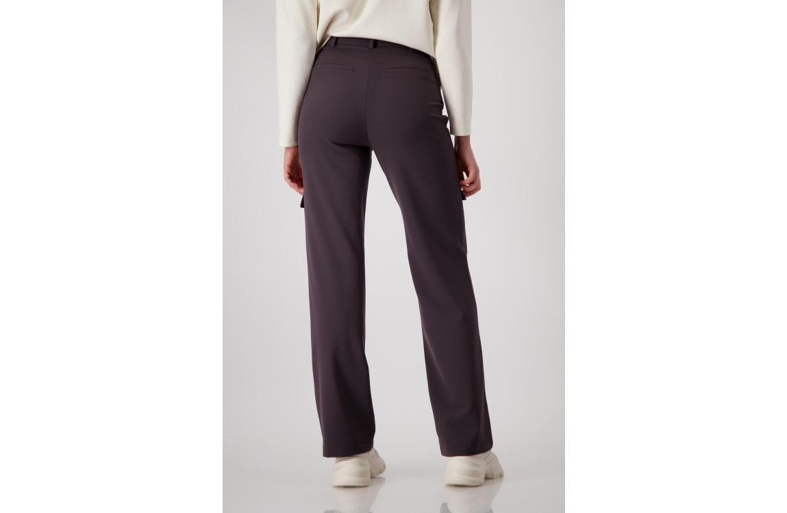 Monari broek 808422. Dit wijdvallende model sluit door middel van een haak en ritssluiting en heeft wijde lange pijpen. Deze bruin grijze broek van Monari is afgewerkt met twee schuine steekzakken aan de voorzijde, twee klepzakken en twee paspelzakken aan de achterzijde.