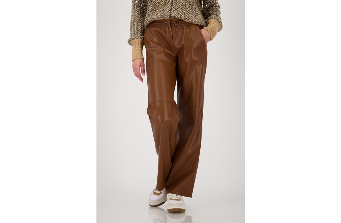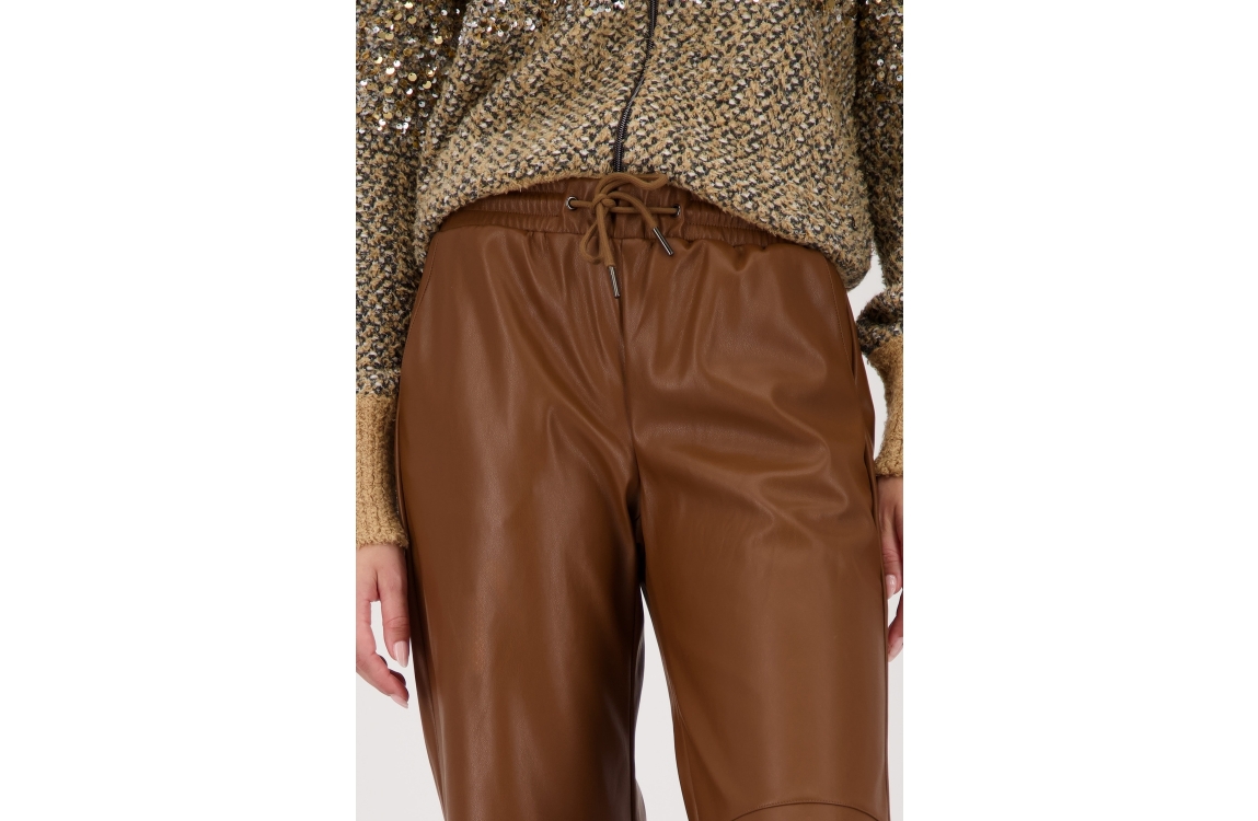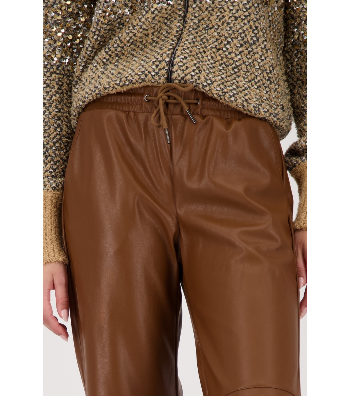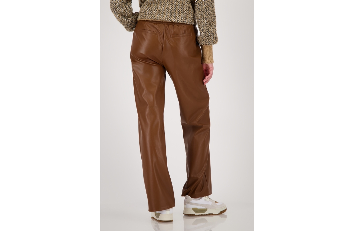 Monari Hose 530 Whiskey. Dit rechtvallende model sluit aan de bovenzijde door middel van een elastische band en een koord. Deze bruine broek van Monari is bewerkt met stiknaaden ter hoogte van de knie. Dit model is voorzien van twee steekzakken.