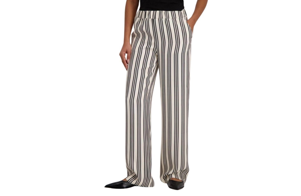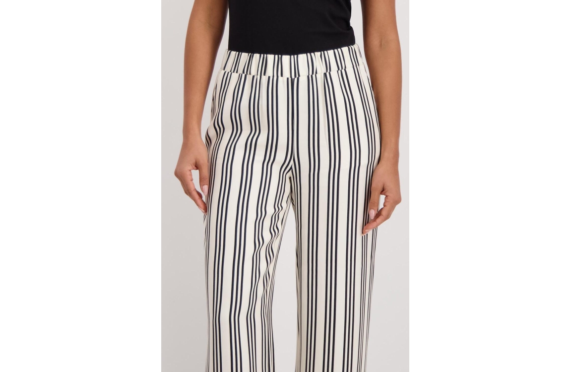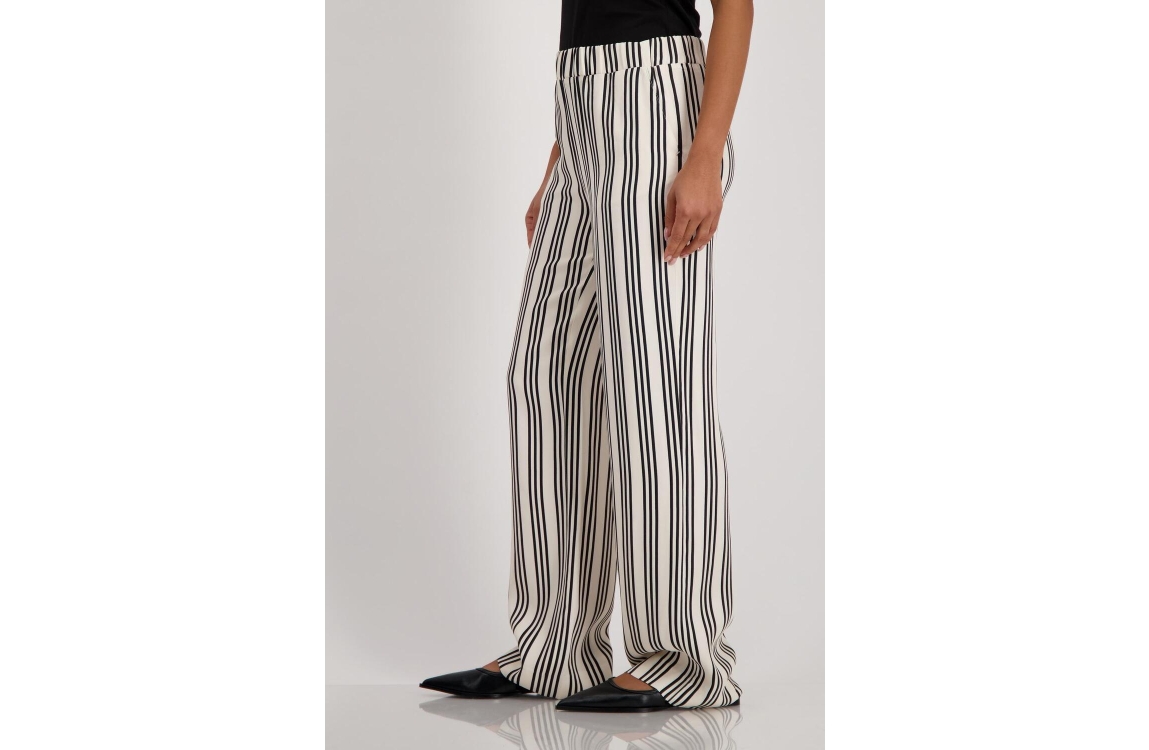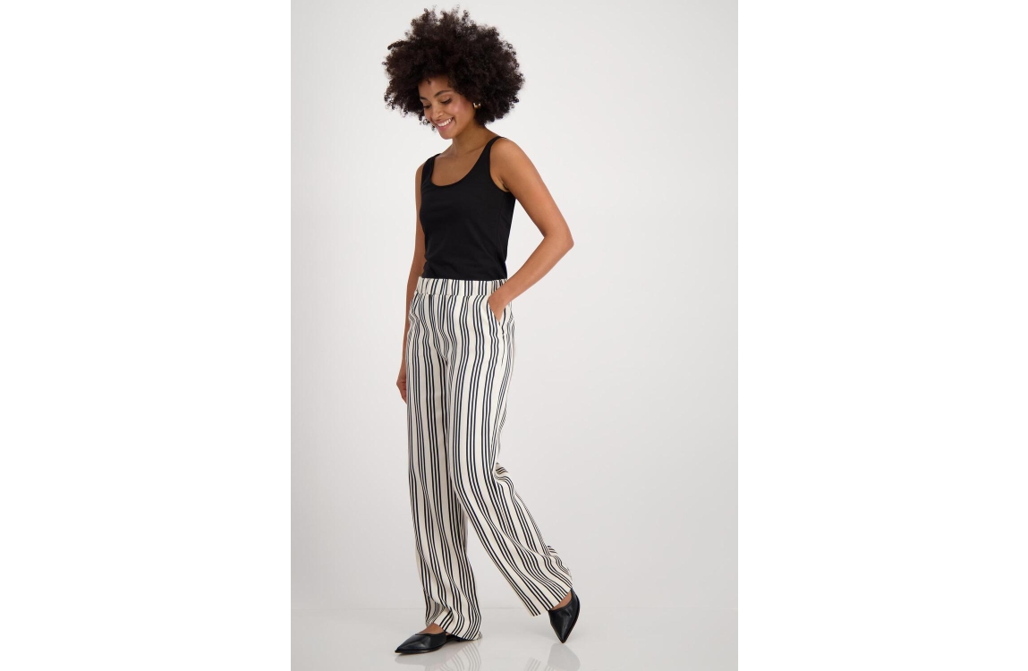 Monari broek410042 998. Dit rechtvallende model heeft een elastische boord. Deze beige/zwarte gestreepte broek van Monari heeft steekzakken en fake paspelzakken achter.