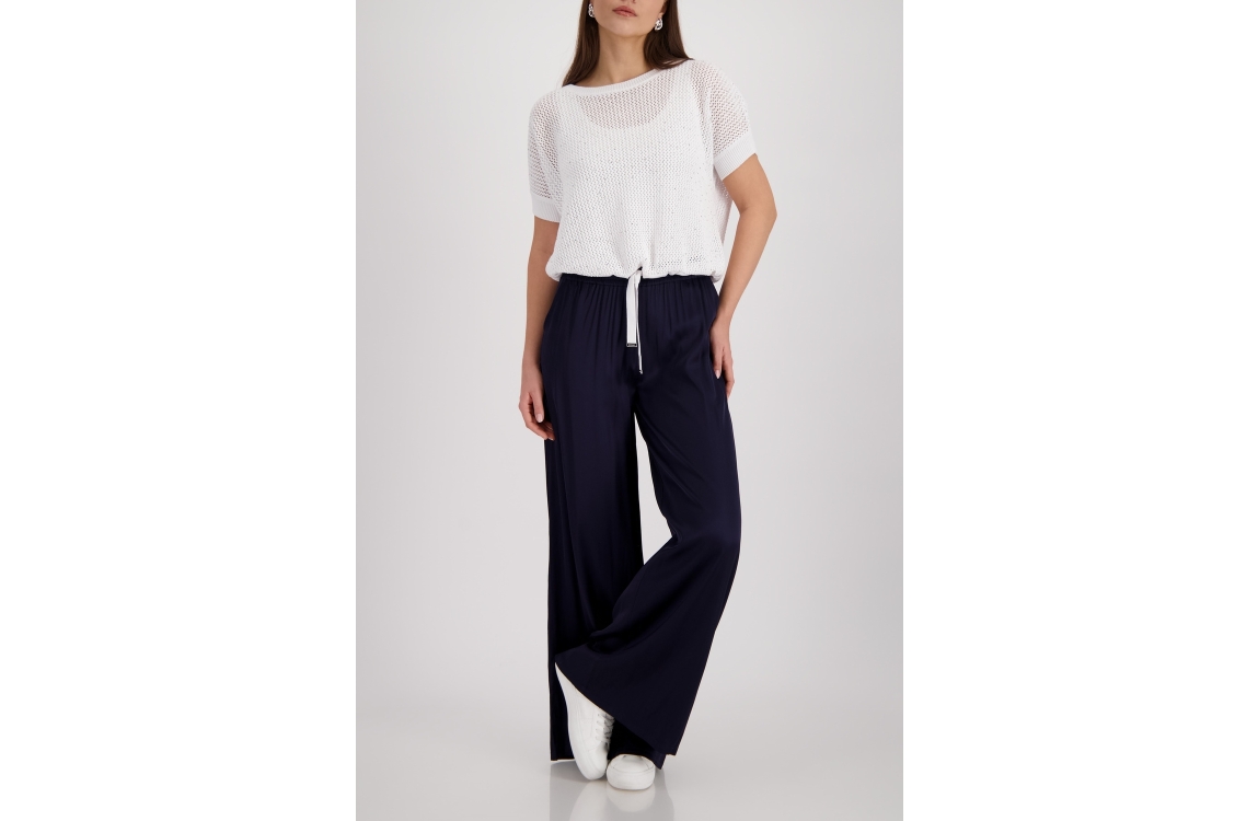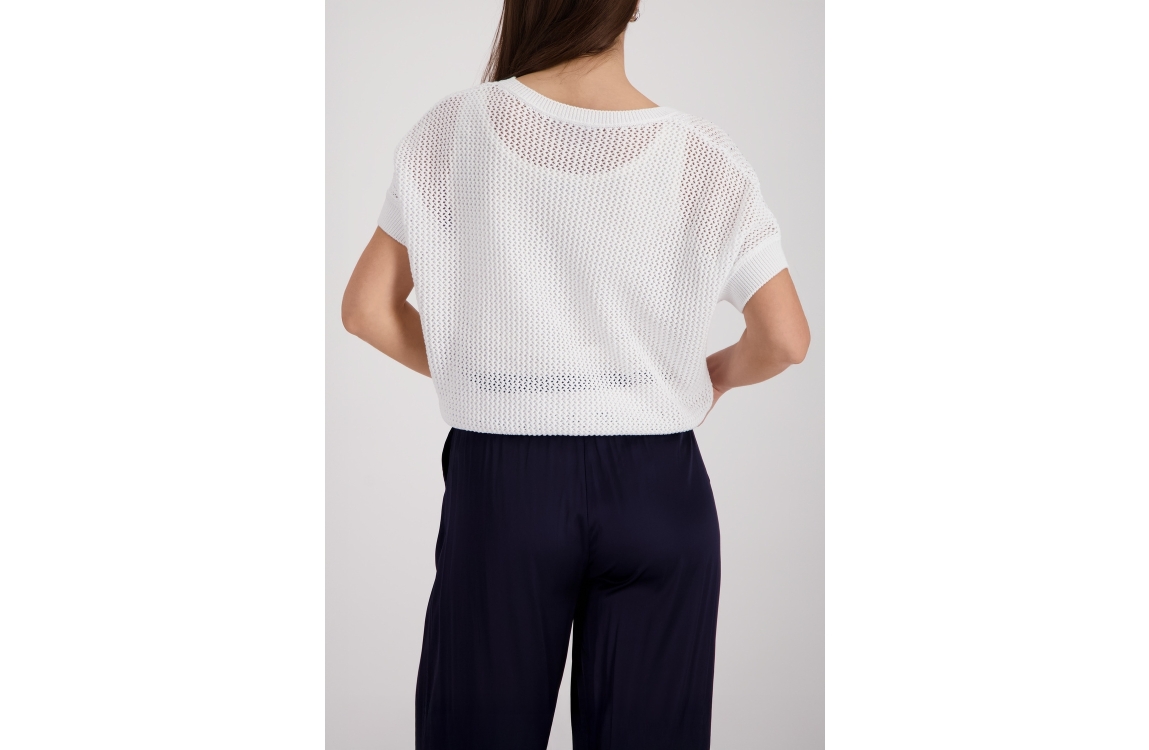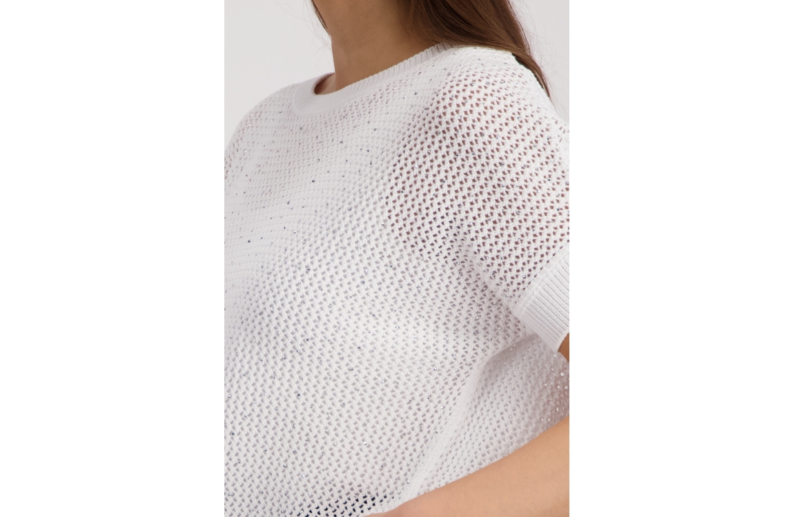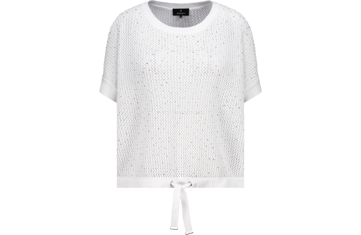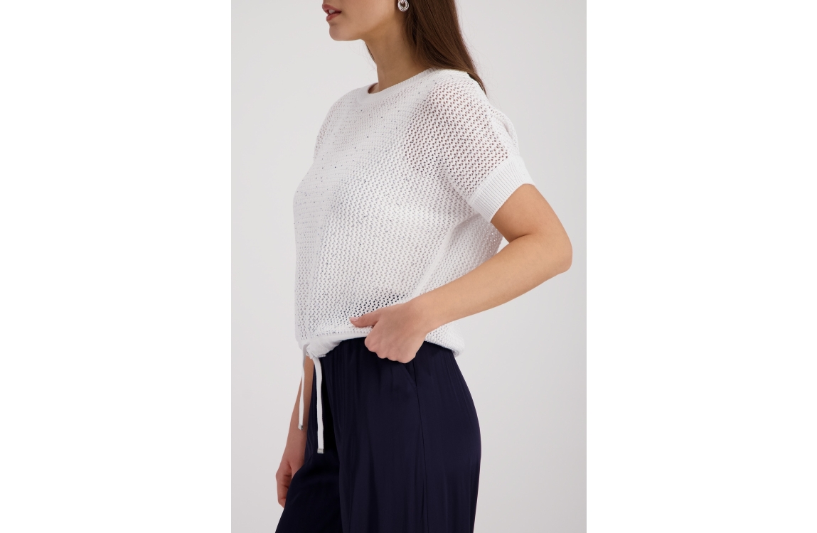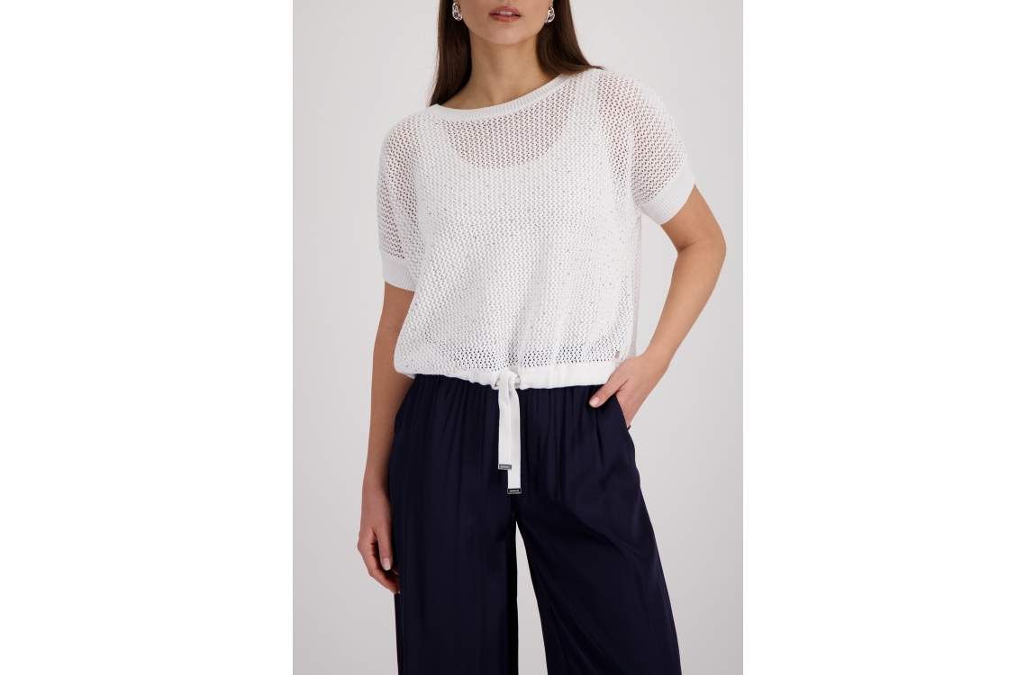 Monari pullover 410875 105. Dit rechtvallende model heeft een ronde halslijn en korte mouwen. Deze creamkleurige pullover van Monari is uitgevoerd in opengehaakte kwaliteit en is op het voorpand gedetailleerd met strass-steentjes. Het model is afgewerkt met een zoom, voorzien van een verstelbaar trekkoord.