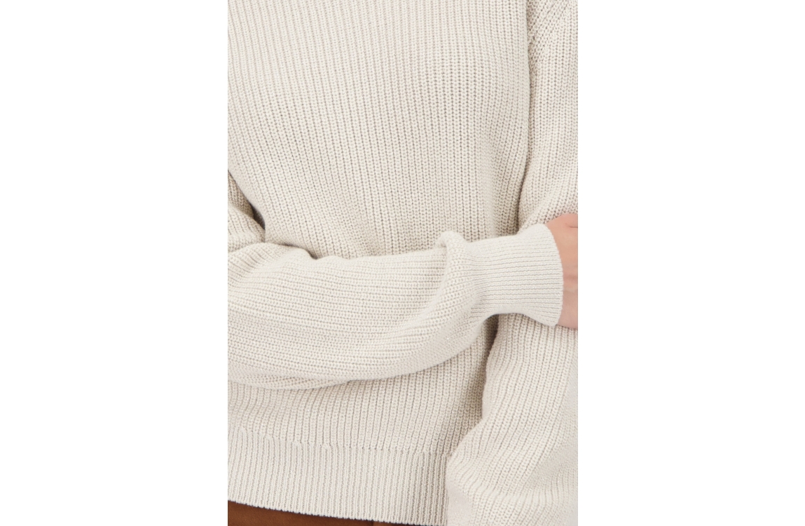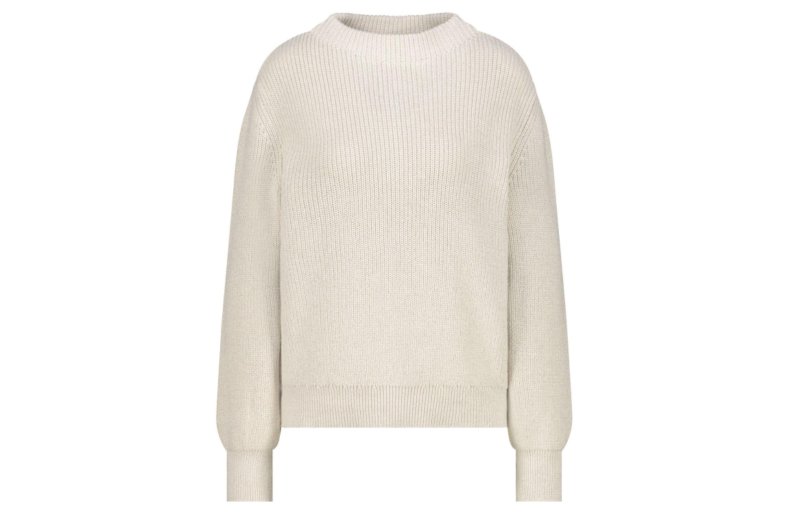 Monari Pullover 134 Almond. Dit rechtvallende model is voorzien van een ronde hals en heeft lange mouwen. Deze beige trui van Monari is uitgevoerd in een grof breisel. Dit model is afgewerkt met boorden en all-over bewerkt met een glitter.