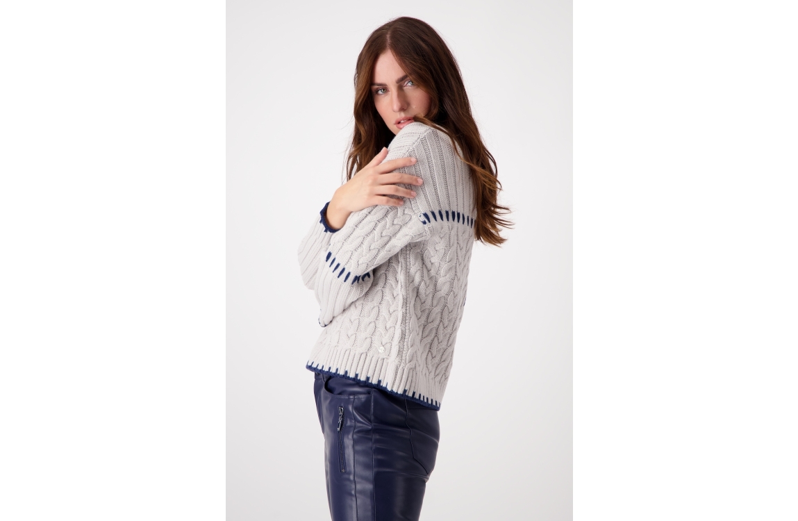 Monari trui 807464. Dit rechtvallend model is voorzien van een turtle neck en heeft lange mouwen. Deze grijze gebreide trui van Monari is bewerkt met een kabelmotief afgewerkt met de kleur blauw.
