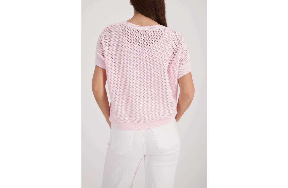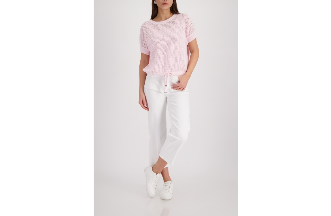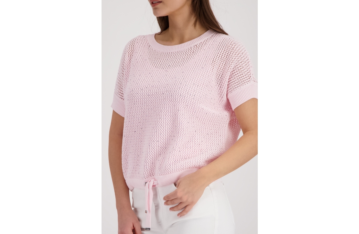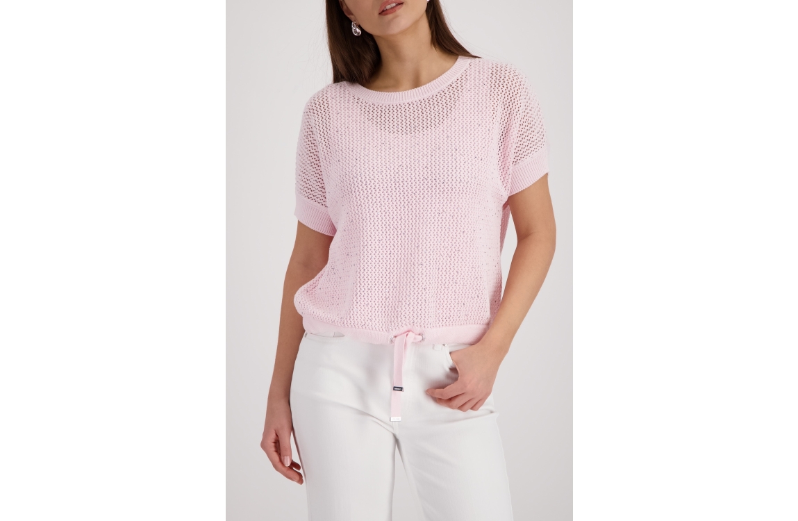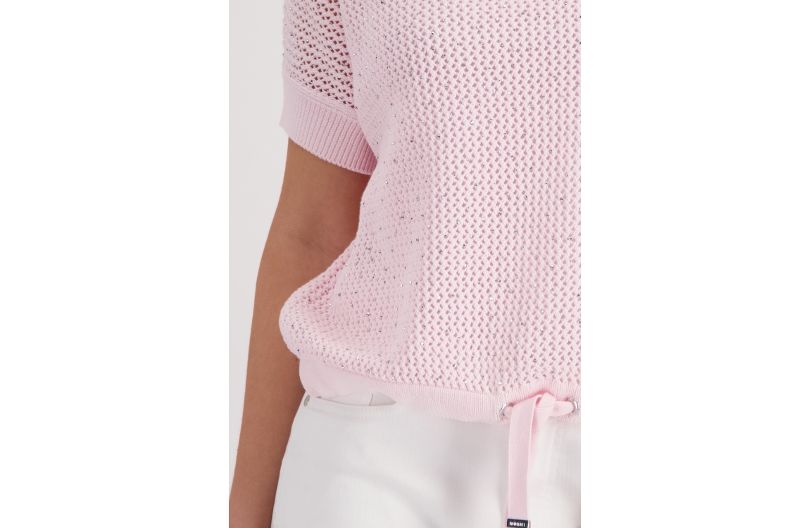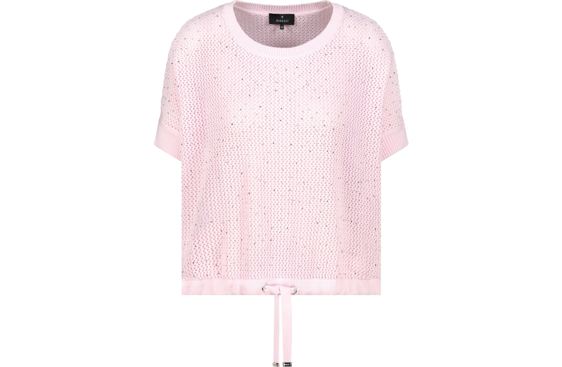 Monari pullover 410875 400. Dit rechtvallende model heeft een ronde halslijn en korte mouwen. Deze lichtroze pullover van Monari is uitgevoerd in opengehaakte kwaliteit en is op het voorpand gedetailleerd met strass-steentjes. Het model is afgewerkt met een zoom, voorzien van een verstelbaar trekkoord.