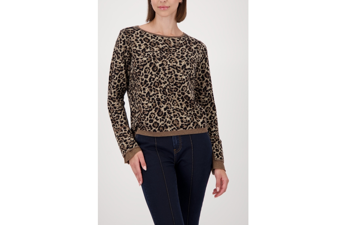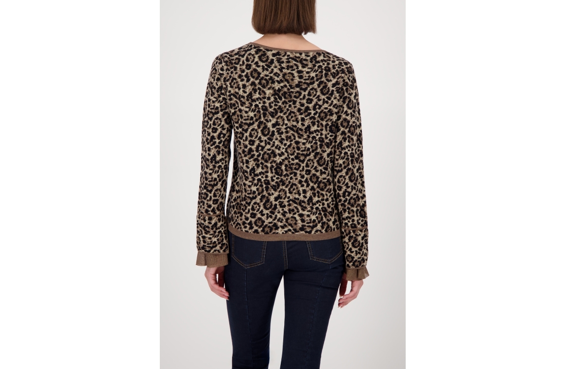 Monari pullover 809184 534. Het rechtvallende model heeft een ronde halslijn en lange mouwen met ruches. Deze pullover van Monari is overal bewerkt met een bruine panterprint in verschillende tinten en heeft afgewerkte, effen boorden.