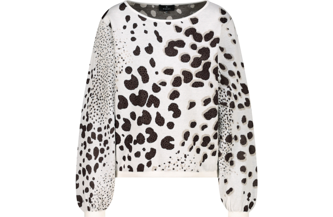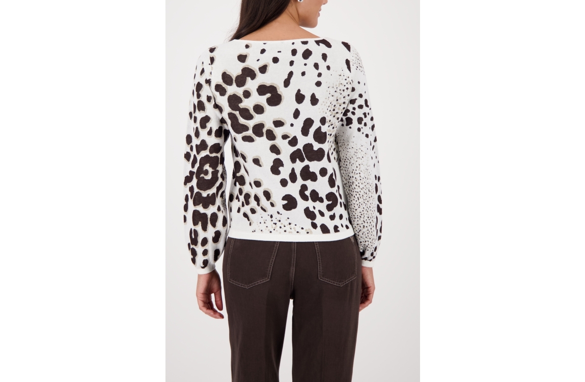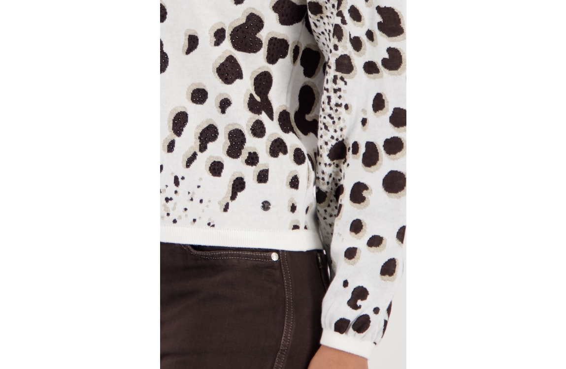 Monari pullover 410292. Dit rechtvallend model is voorzien van een ronde hals en heeft lange mouwen. Deze bruine/grijze vest van Monari is all-over bewerkt met een leopard print afgewerkt met strass steentjes.