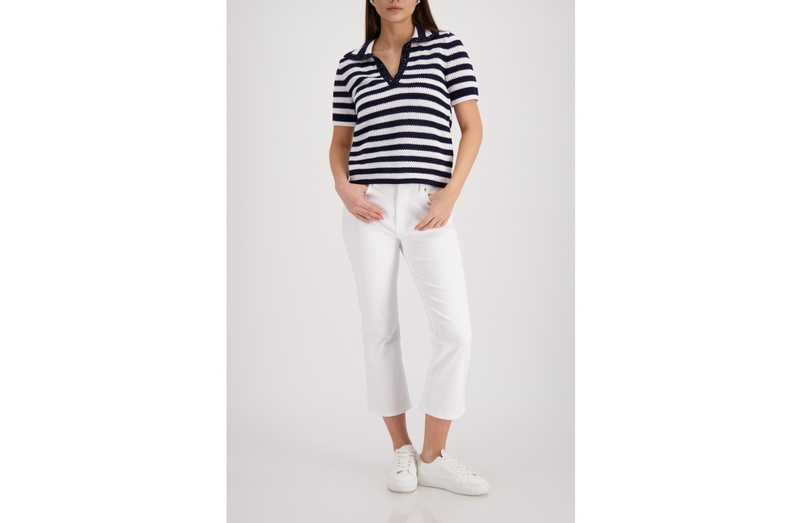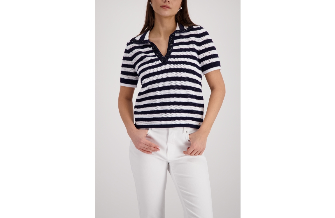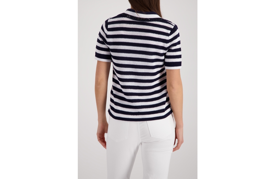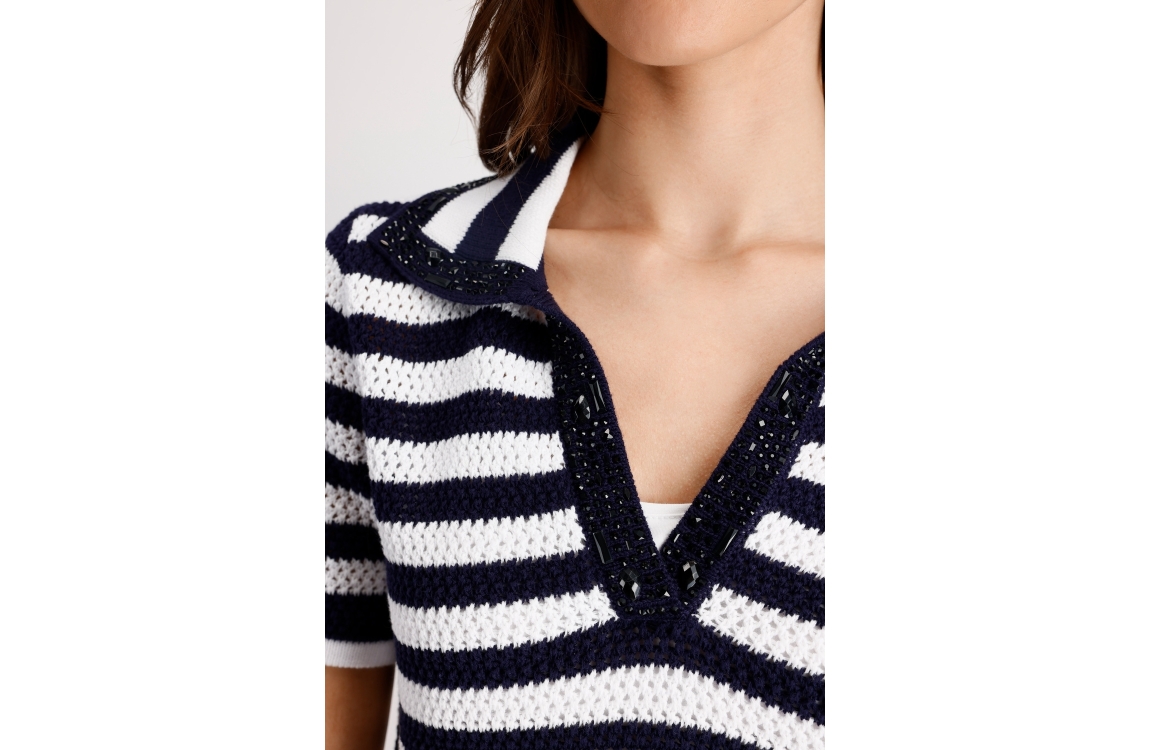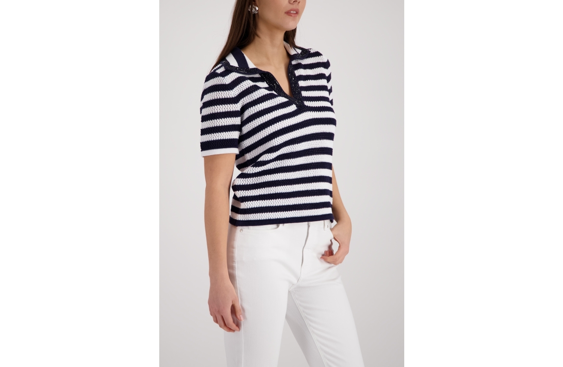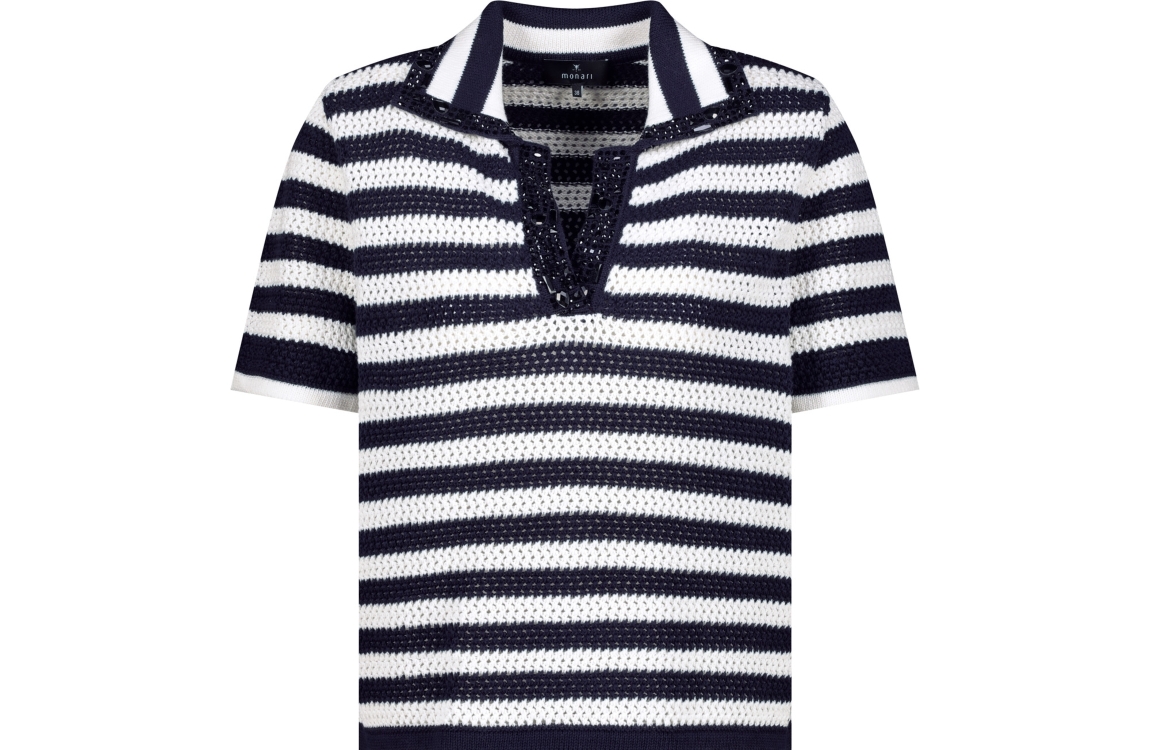 Monari pullover 410906 756. Dit rechtvallende model heeft een kraag met V-inkeping en korte mouwen. Deze donkerblauwe pullover van Monari is uitgevoerd in een opengewerkt breisel met een streepdessin en is bij de halslijn afgewerkt met decoratieve steentjes.