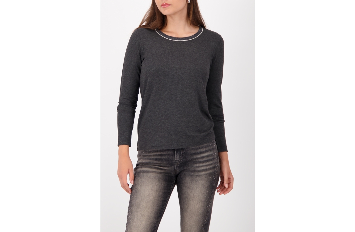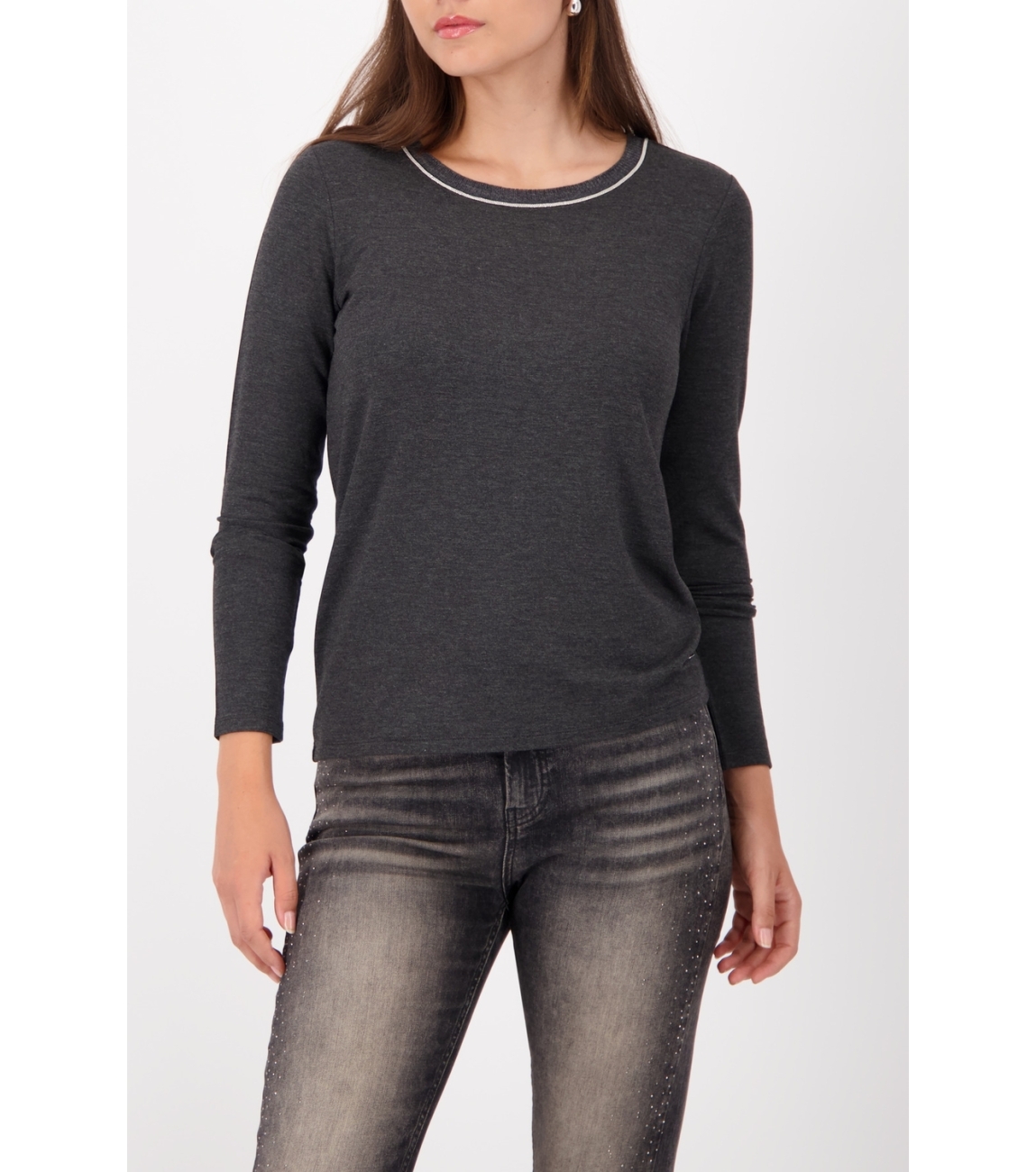 Monari Pullover 888 Anthra mel. Dit rechtvallende model is voorzien van een ronde hals en heeft lange mouwen. Deze grijze top van Monari is bewerkt met strass steentjes rond de hals.