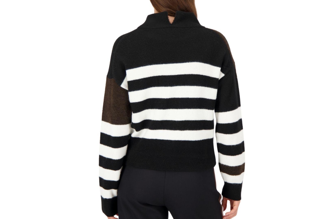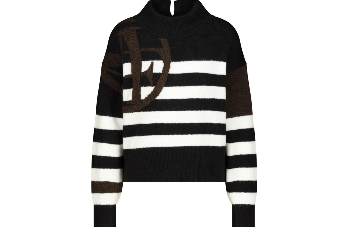 Monari pullover 809475 997. Dit rechtvallende model heeft een turtleneck met splitdetail en lange mouwen. Deze zwarte pullover van Monari is all-over bewerkt met een witte streepprint en een bruinkleurige merkdetail op de schouder. Het model is afgewerkt met ribgebreide boorden.