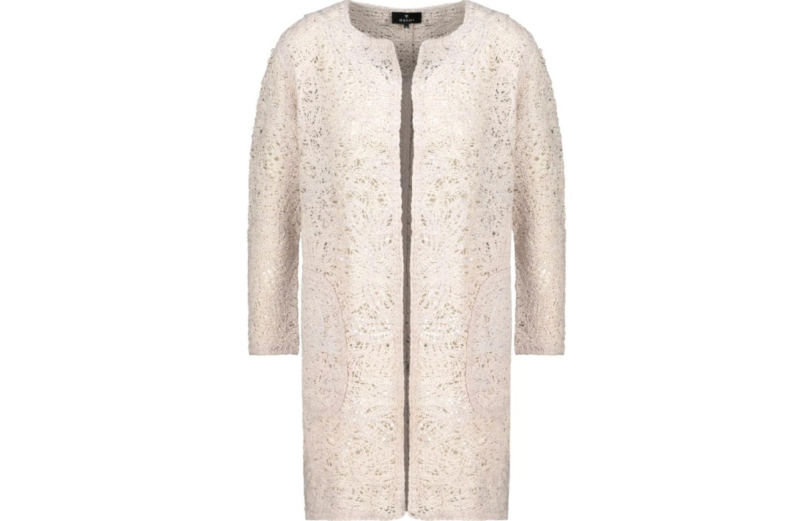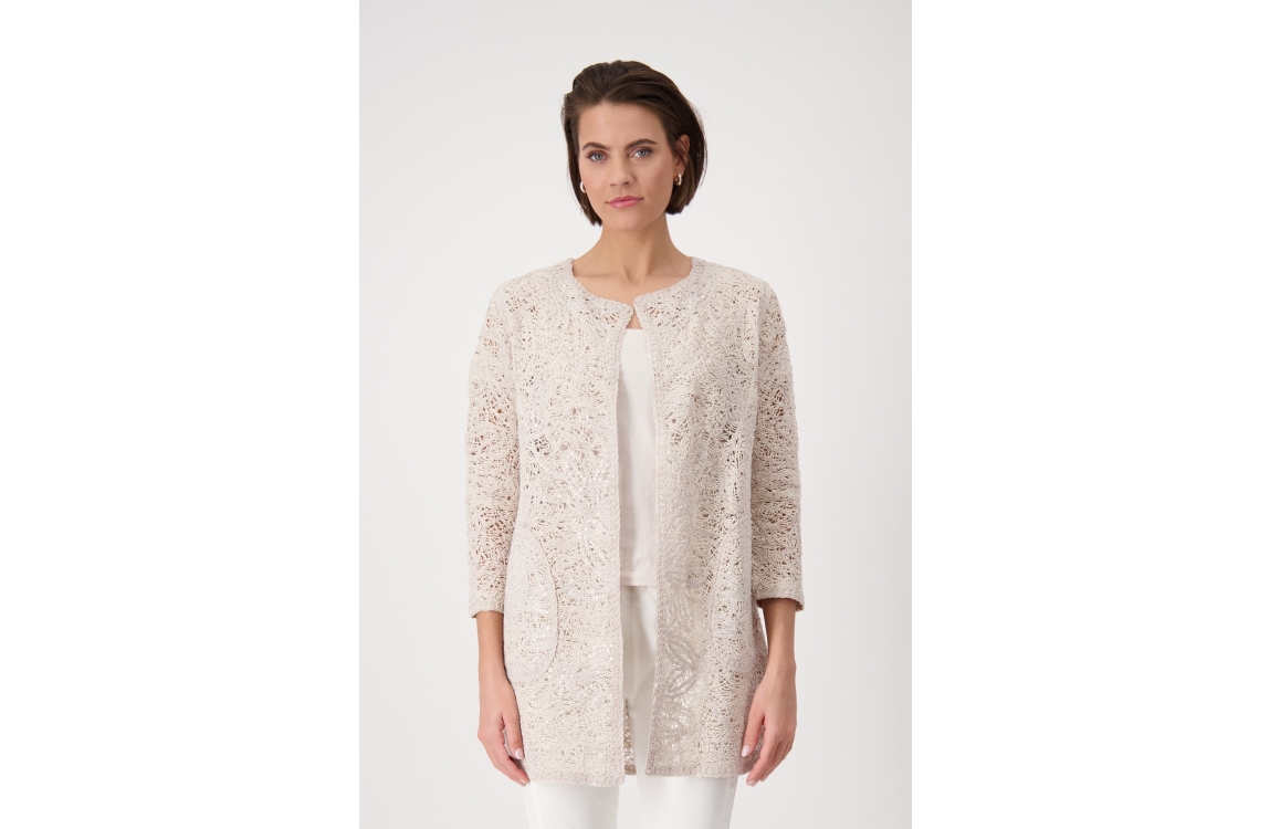 Monari vest 409459. Dit openvallend model is voorzien van een ronde hals en heeft driekwart mouwen. Deze zandkleurige vest van Monari is gehaakt uitgevoerd en afgewerkt met pailletten.
