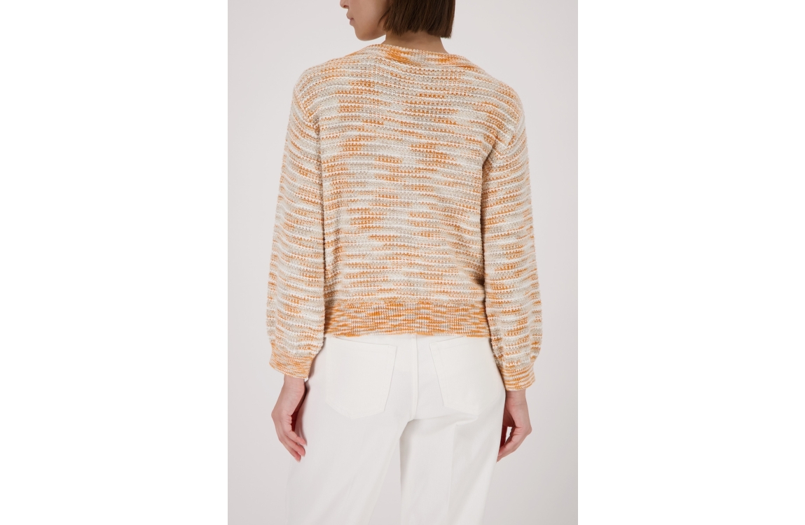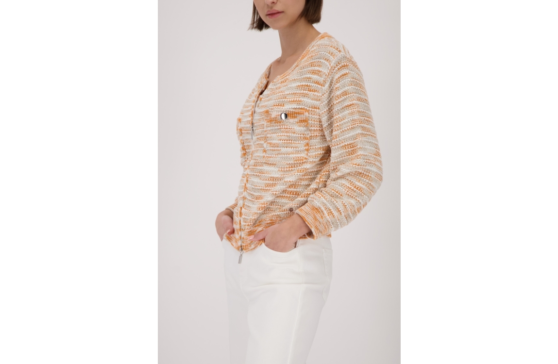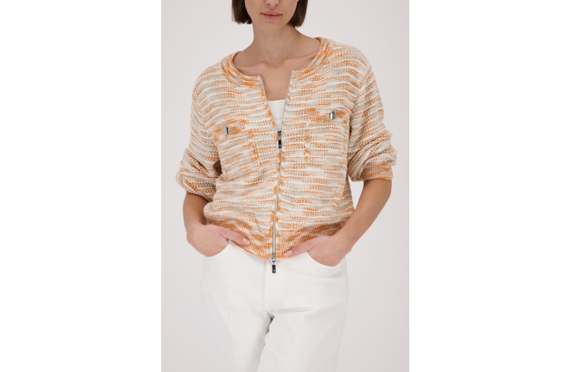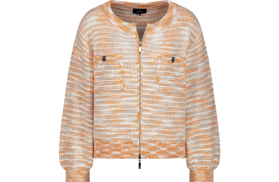 Monari vest 410384 124. Dit rechtvallende model heeft een ronde halslijn en lange mouwen. Deze champagnekleurige vest van Monari sluit aan de voorzijde door middel van een rits en is voorzien van twee sluitbare borstzakken. Het model is uitgevoerd in een grove breisel met de kleuren: oranje, wit en champagne.