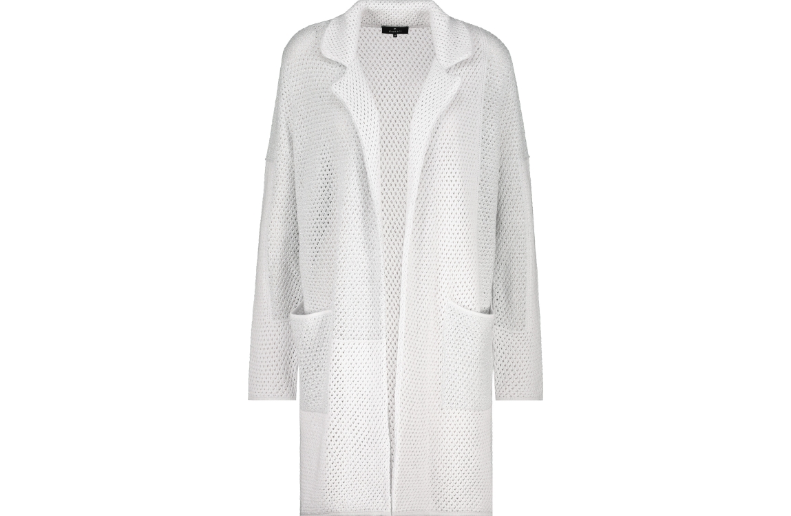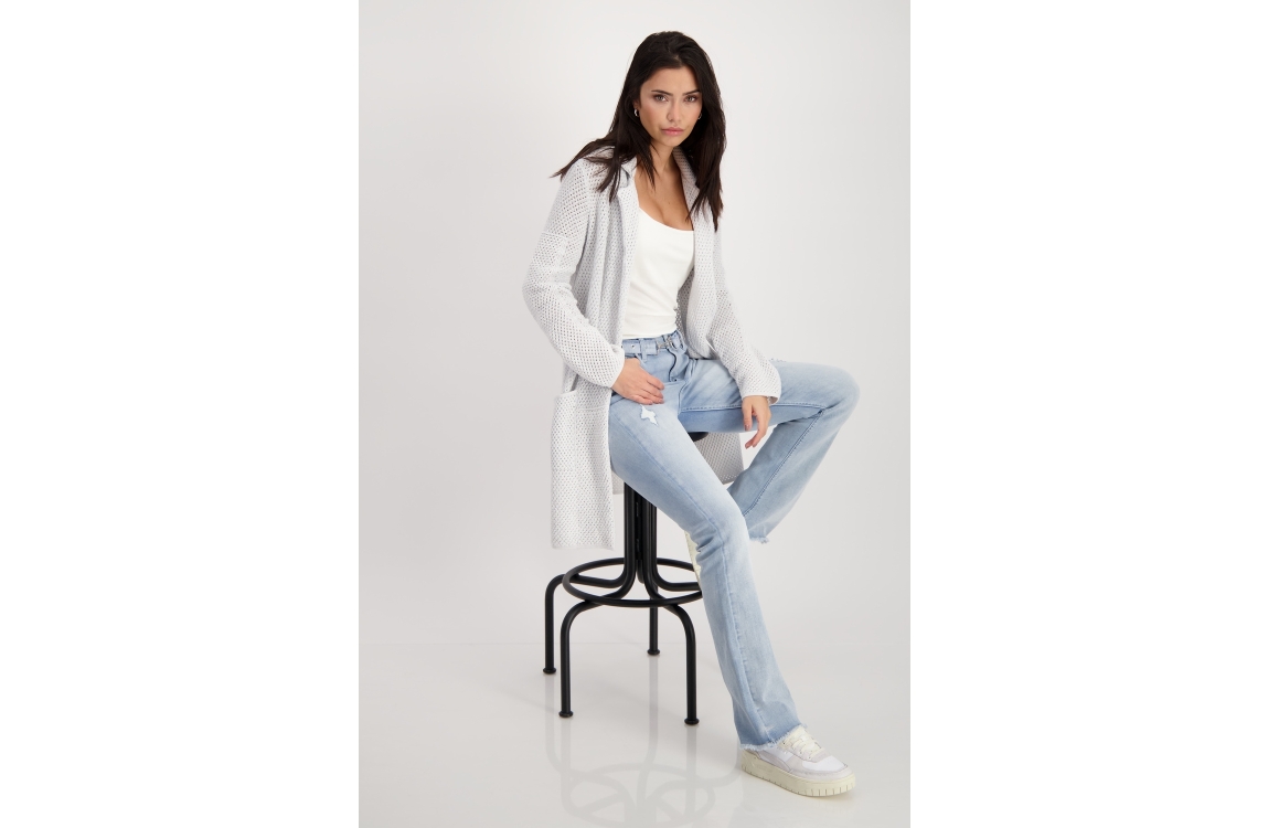 Monari vest 408292. Dit wijdvallende model is voorzien van een revers kraag en heeft lange mouwen. Dit zilveren vest van Monari is uitgevoerd in een opengewerkte kwaliteit voorzien van een lurex draad. Dit model is afgewerkt met twee steekzakken aan de voorzijde.