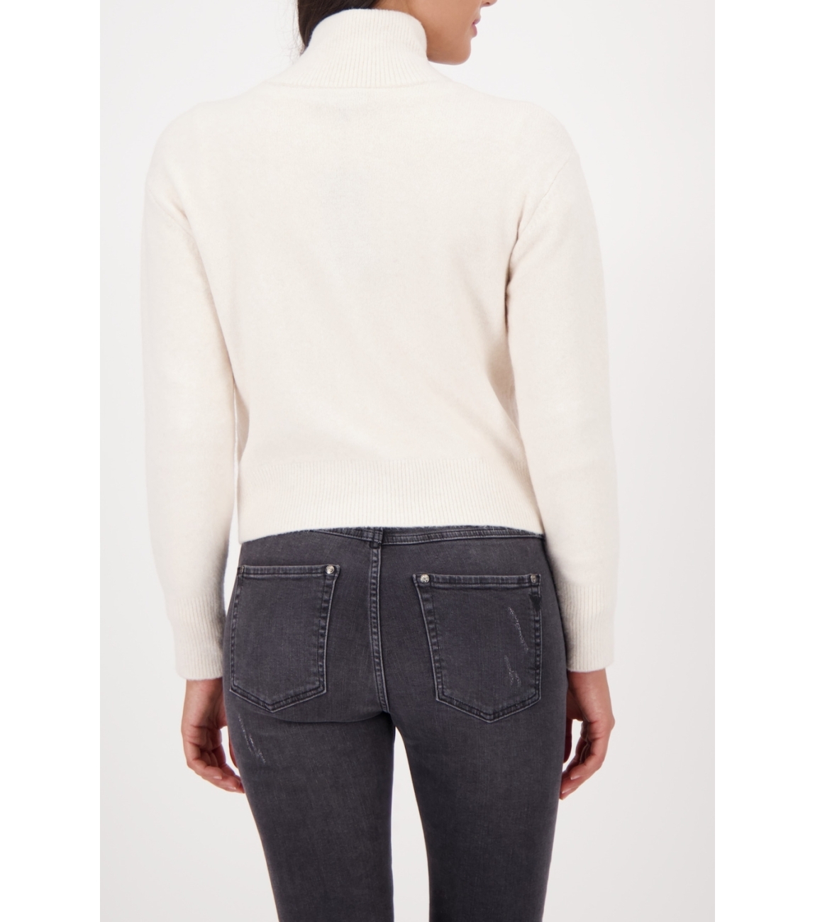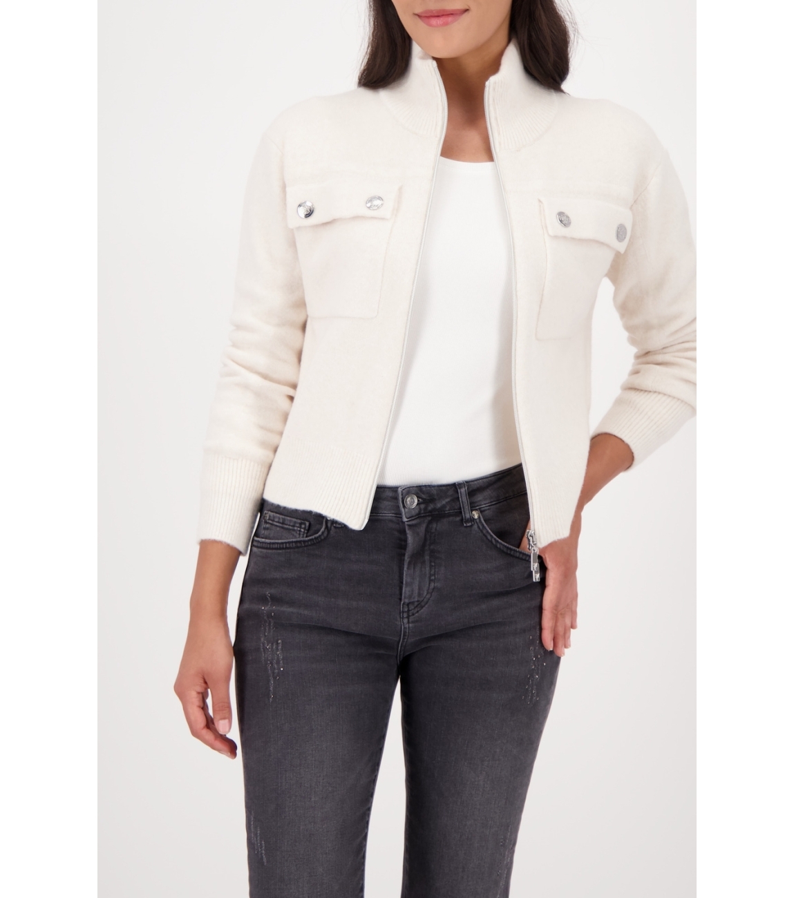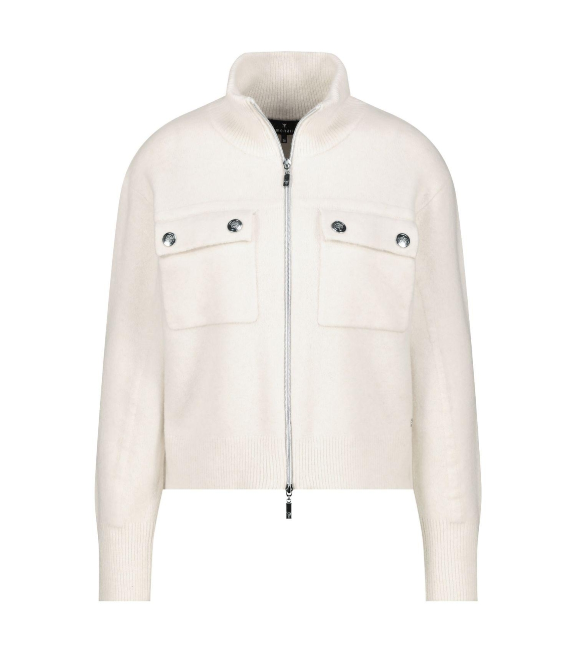 Monari Strickjacke 134 Almond. Dit rechtvallende model heeft een opstaande kraag en lange mouwen. Deze off-white vest van Monari sluit door middel van een rits en beschikt over zakken op het voorpand.