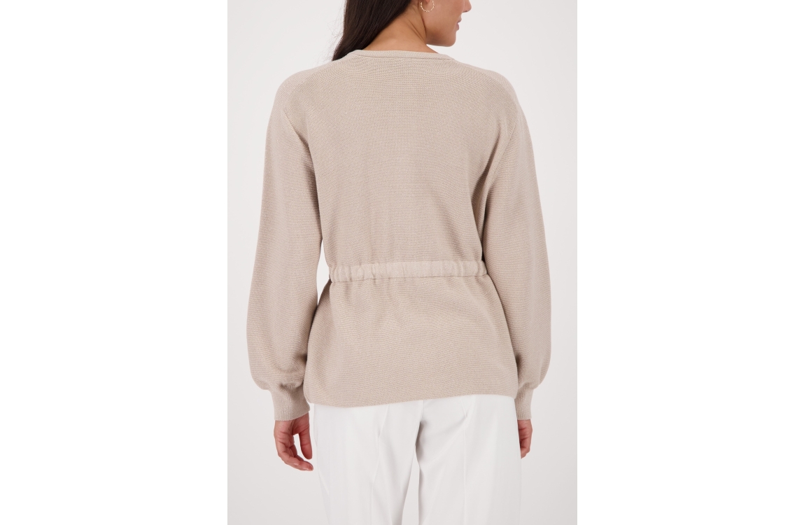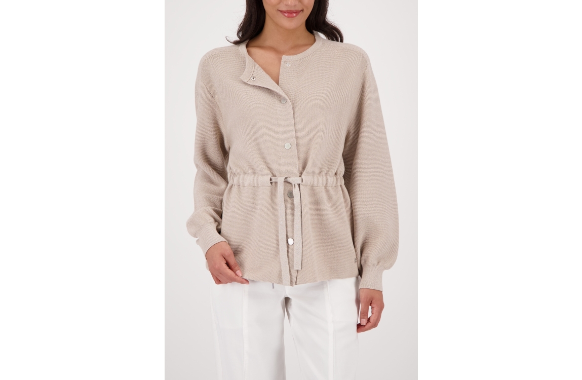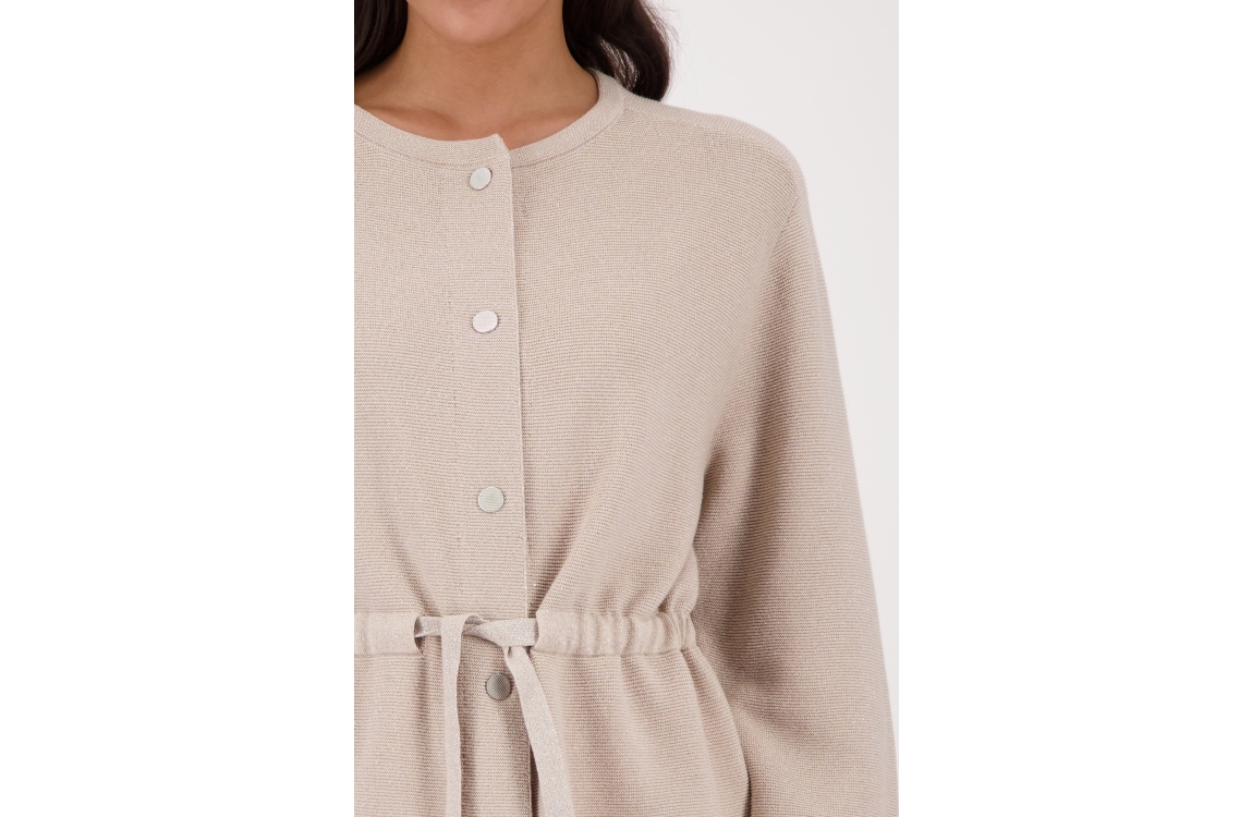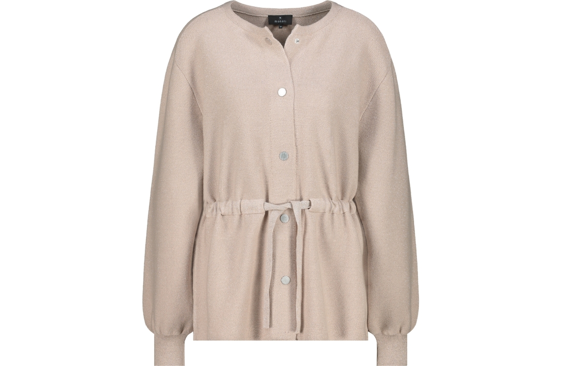 Monari vest 410297. Dit rechtvallend model is voorzien van een ronde hals en heeft lange mouwen. Deze zandkleurige vest van Monari sluit door middel van knopen en een trekkoord in de taille. Dit model is all-over bewerkt met glitter.