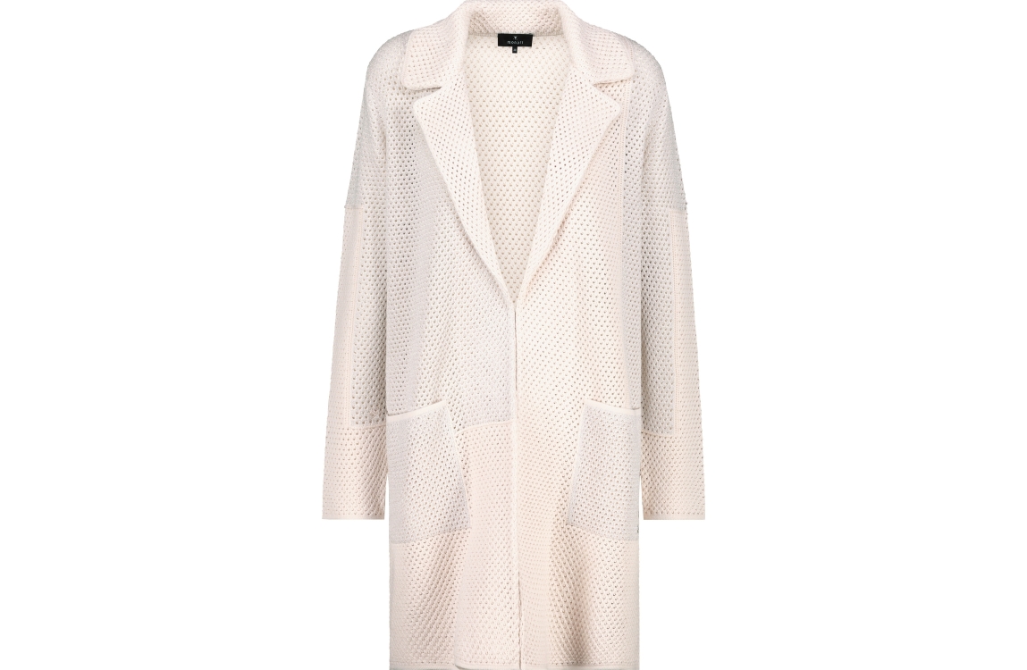 Monari vest 408292. Dit openvallend model is voorzien van een reverskraag en heeft lange mouwen. Deze beige opengewerkte vest van Monari beschikt over twee steekzakken aan de voorzijde en over zijsplitten. Dit model is gedeeltelijk bewerkt met glitter.