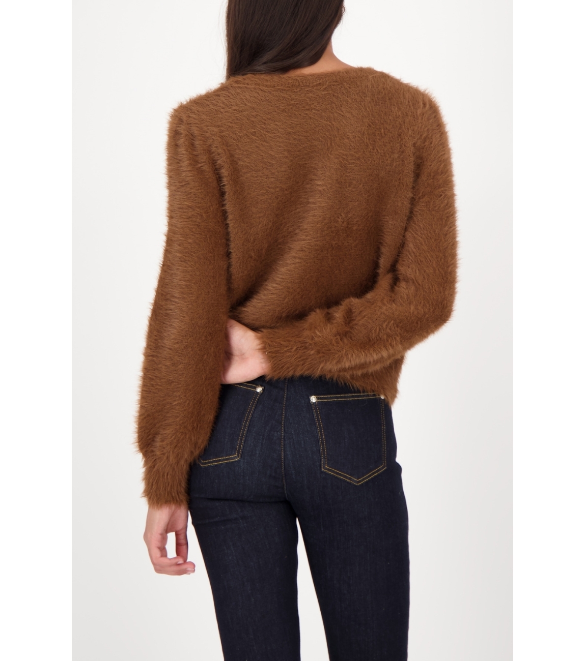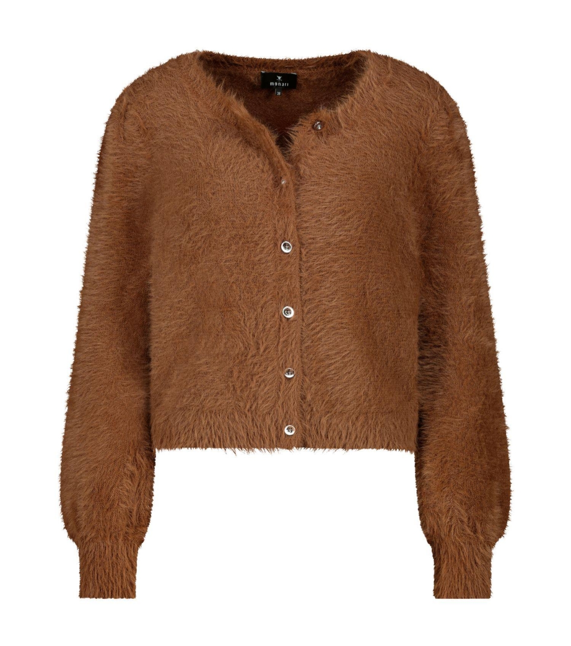 Monari Strickjacke 530 Whiskey. Dit rechtvallende model is voorzien van een ronde hals en heeft lange mouwen. Dit bruine vest van Monari sluit door middel van knopen en is all-over faux fur uitgevoerd.