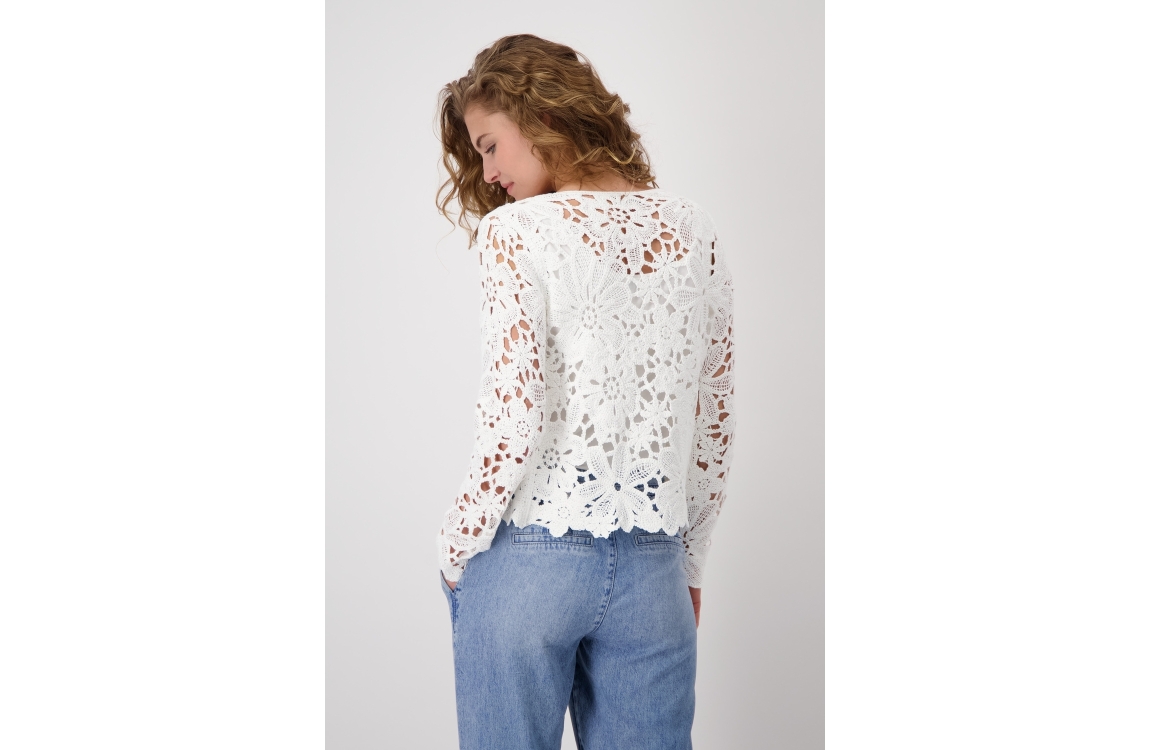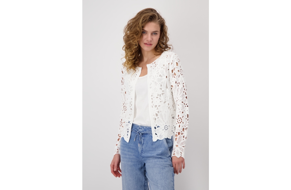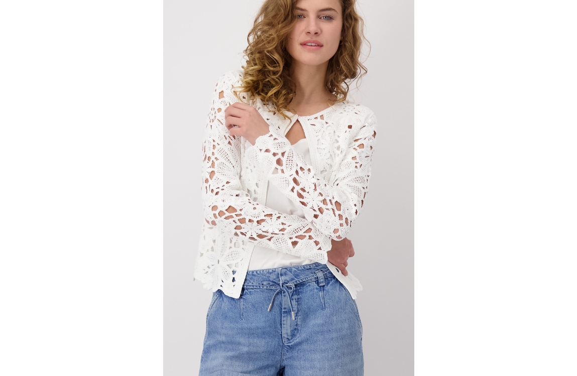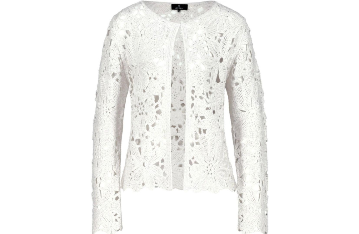Monari vest 409471. Dit rechtvallend model is voorzien van een ronde hals en heeft lange mouwen. Deze witte vest van Monari sluit aan de bovenzijde door middel van een haaksluiting en is all-over uitgevoerd in een gehaakte kwaliteit.