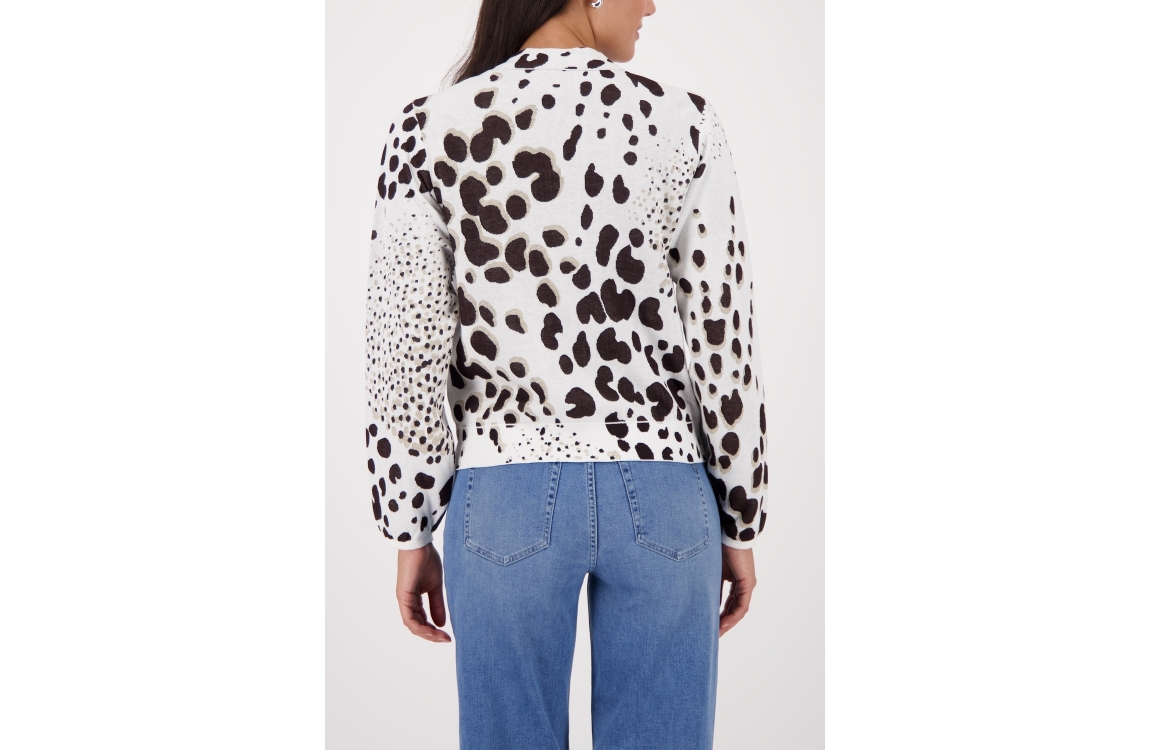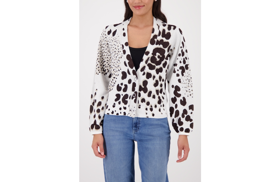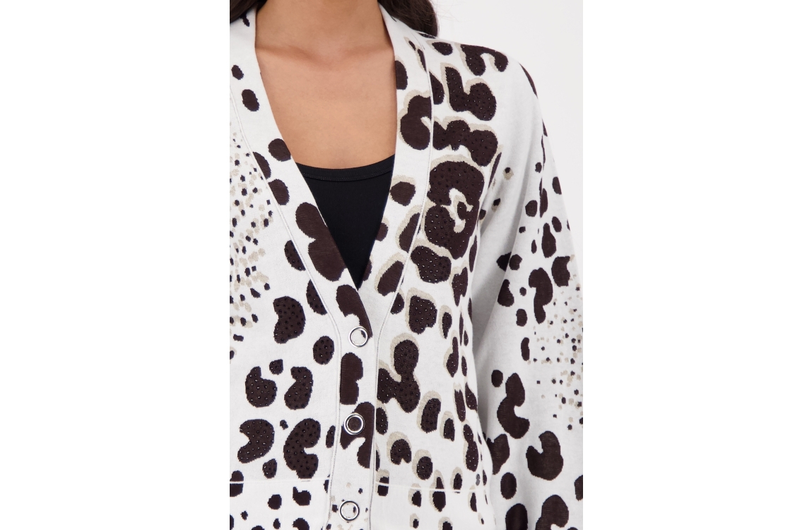 Monari vest 410285. Dit rechtvallend model is voorzien van een v-hals en heeft lange mouwen. Deze grijze/bruine vest van Monari sluit door middel van knopen en is all-over bewerkt met een leopard print afgewerkt met strass steentjes.