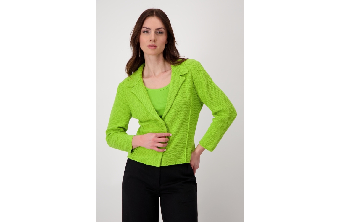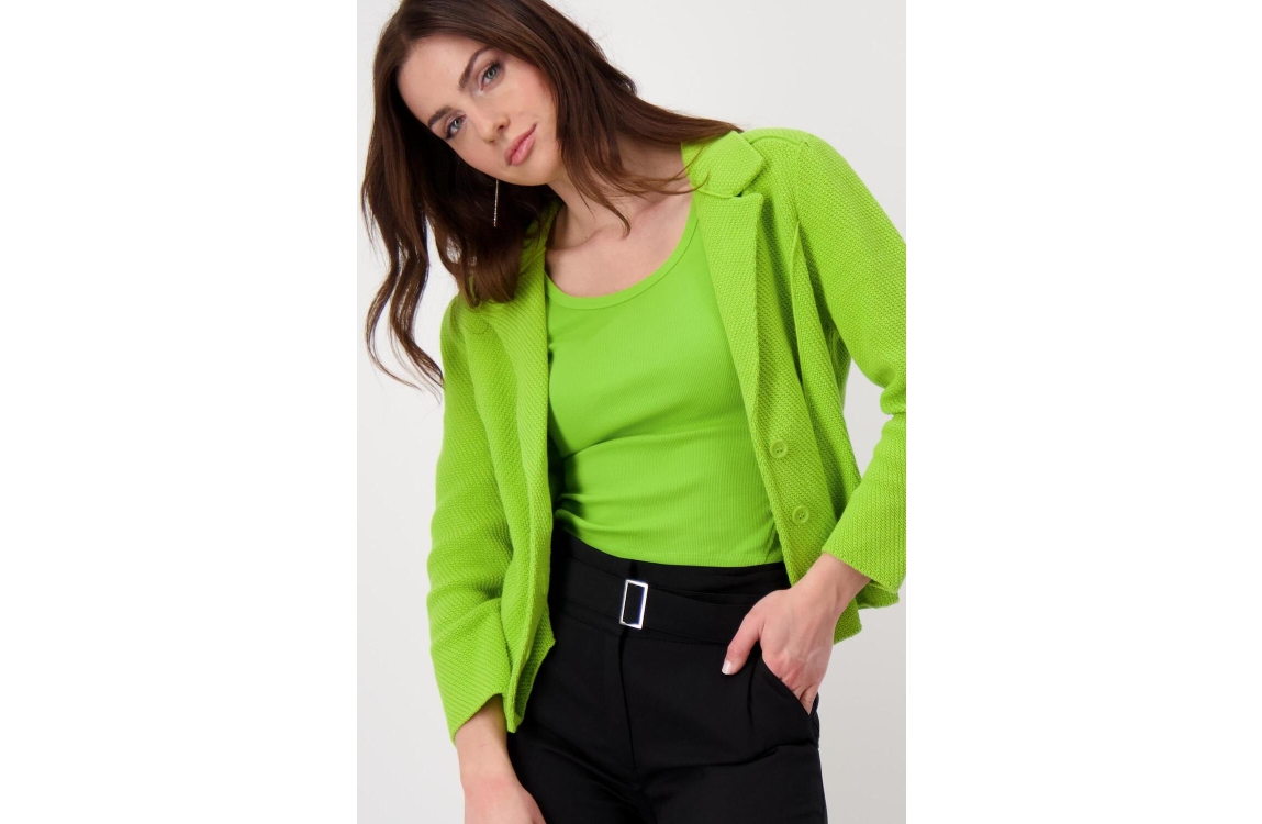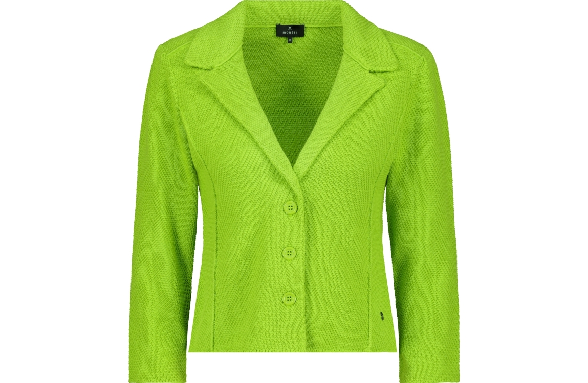 Monari blazer 408896. Dit aangesloten model is voorzien van een reverskraag en heeft lange mouwen. Deze groene blazer van Monari sluit door middel van knopen en beschikt over schoudervulling. Dit model is gestructureerd uitgevoerd.
