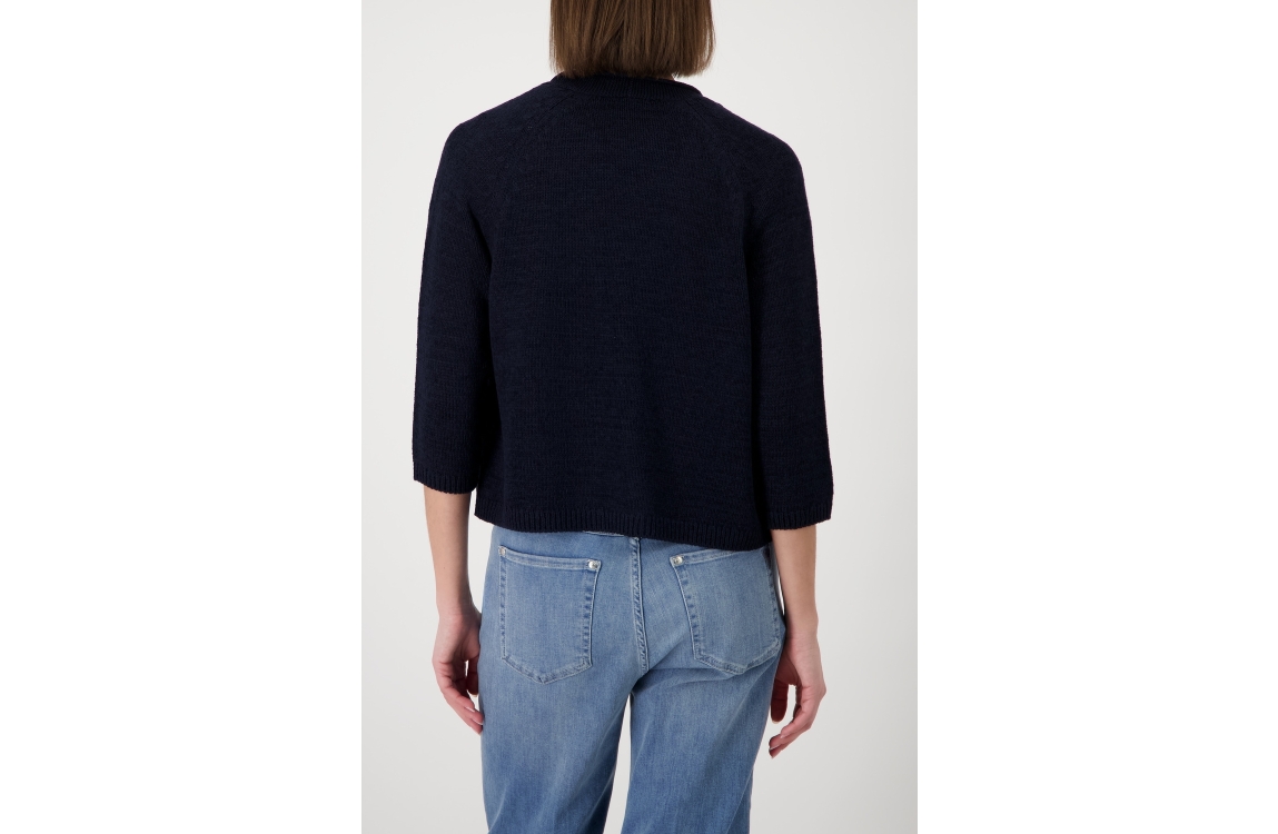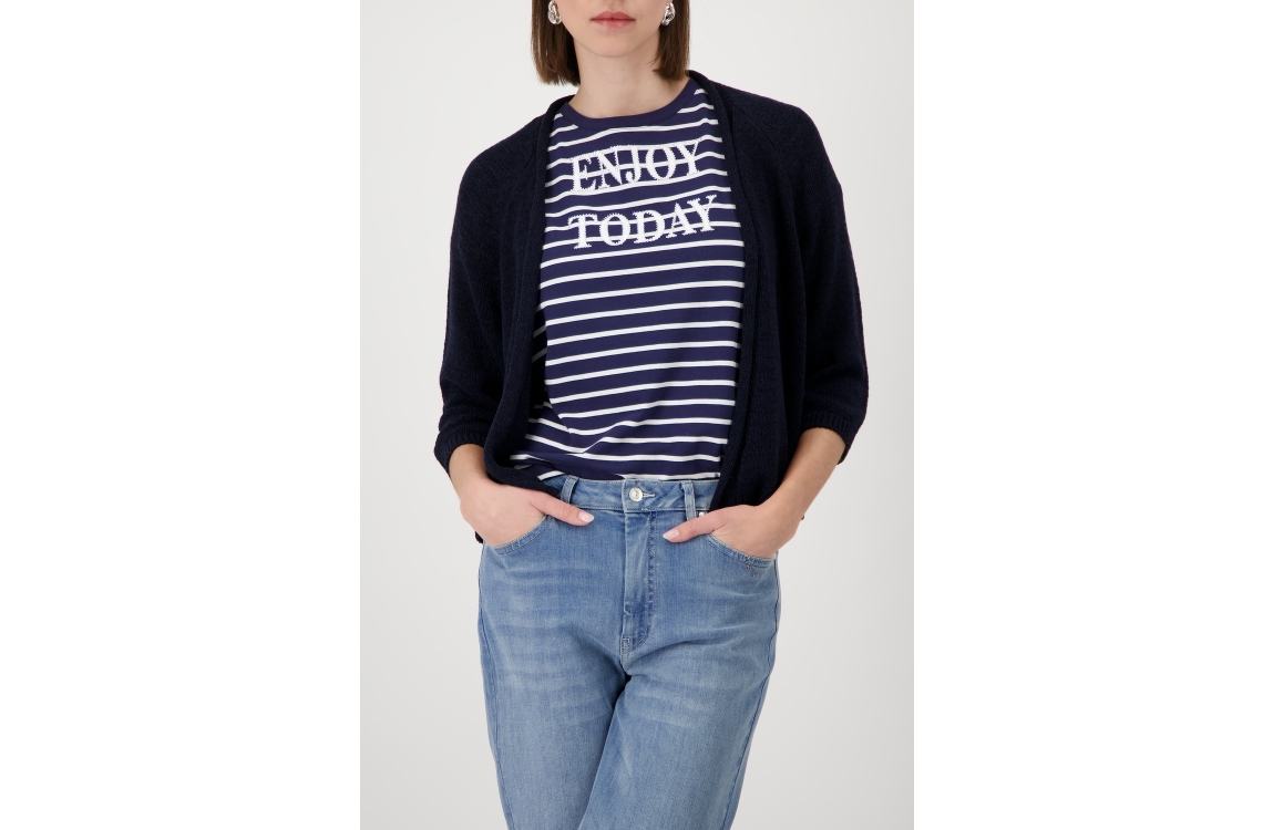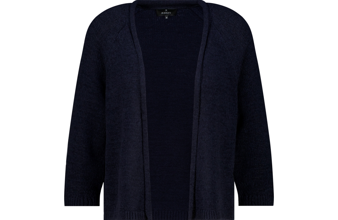 Monari vest 410915. Dit losvallend model is voorzien van een ronde hals en heeft driekwart mouwen. Deze donkerblauwe vest van Monari is gebreid uitgevoerd.