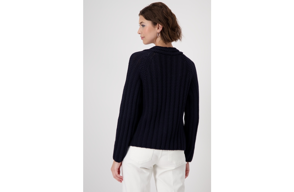 Monari vest 409225. Dit rechtvallend model is voorzien van een ronde hals en heeft lange mouwen. Deze donkerblauwe vest van Monari valt open en is grof gebreid.