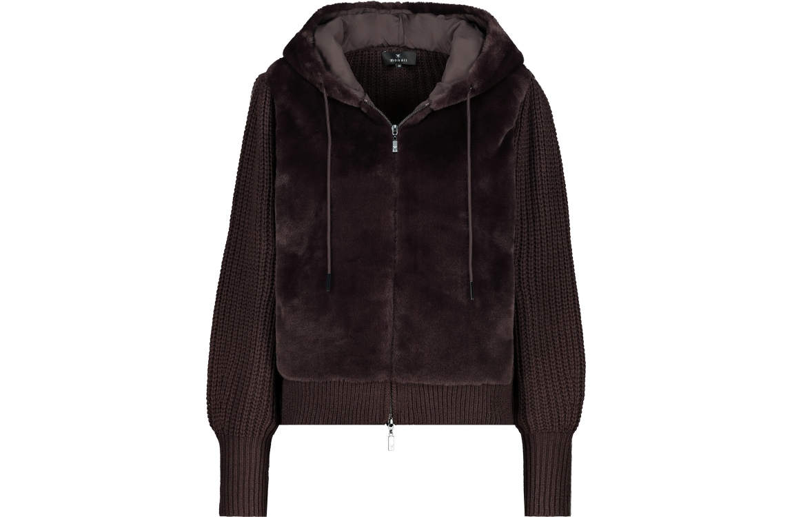 Monari vest 808323. Dit regularfit model is voorzien van een capuchon en heeft lange mouwen. Dit bruine vest van Monari sluit door middel van een rits en is uitgevoerd met fake fur voorpand. Dit model is voor de rest uitgevoerd in een gebreide kwaliteit.