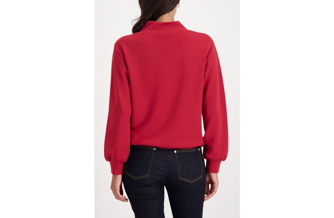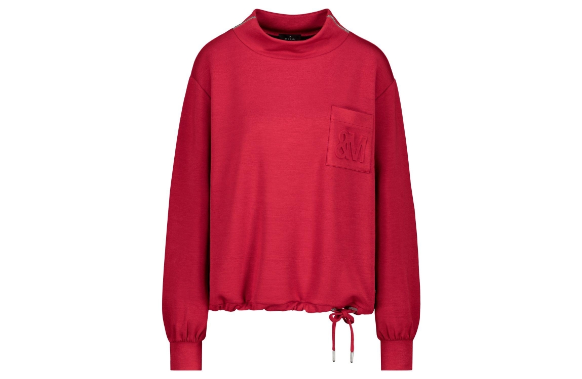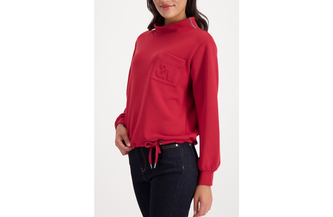 Monari Sweatshirt 310 Chimney red. Dit rechtvallende model heeft een ronde hals en lange mouwen. Deze rode top van Monari is bewerkt met een decoratieve borstzak en heeft een trekkoord in de zoom.