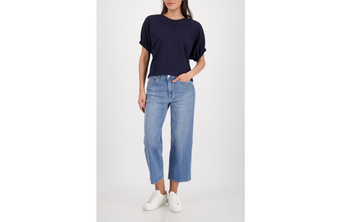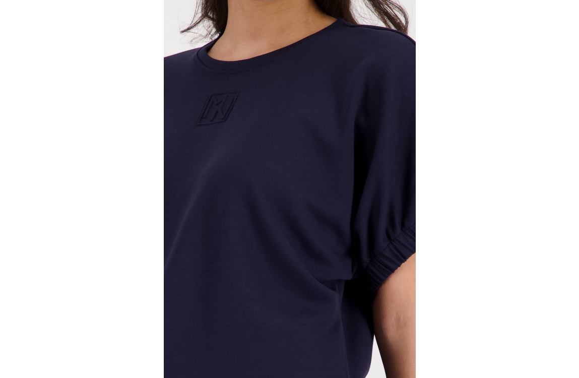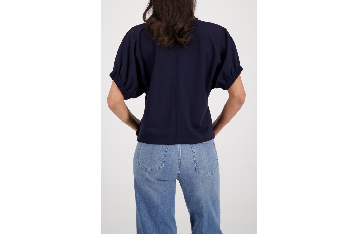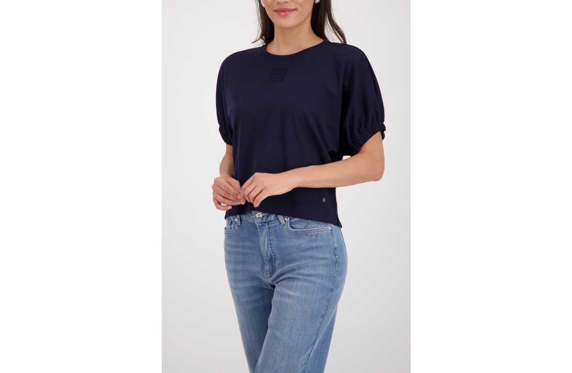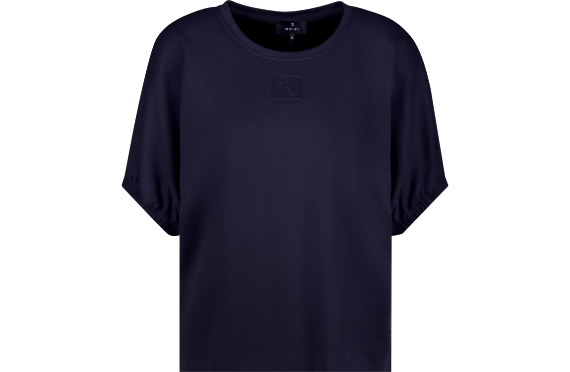 Monari shirt 410802 755. Dit soepelvallende model heeft een ronde halslijn en korte pofmouwen met elastische boorden. Dit donkerblauwe shirt van Monari is op het voorpand gedetailleerd met het merkembleem en is uitgevoerd in stretchkwaliteit.