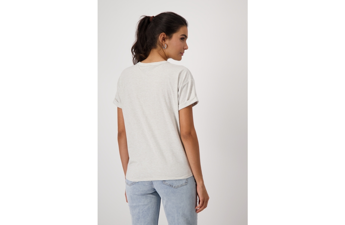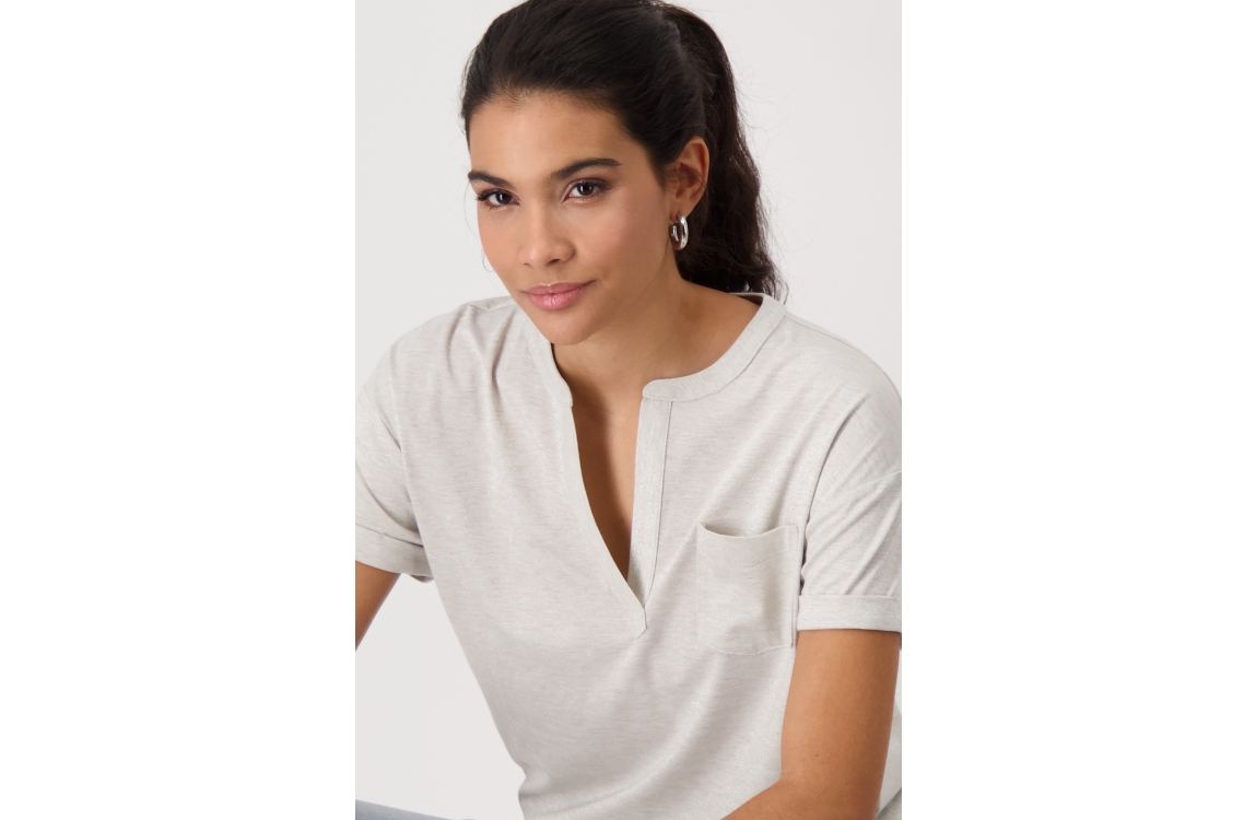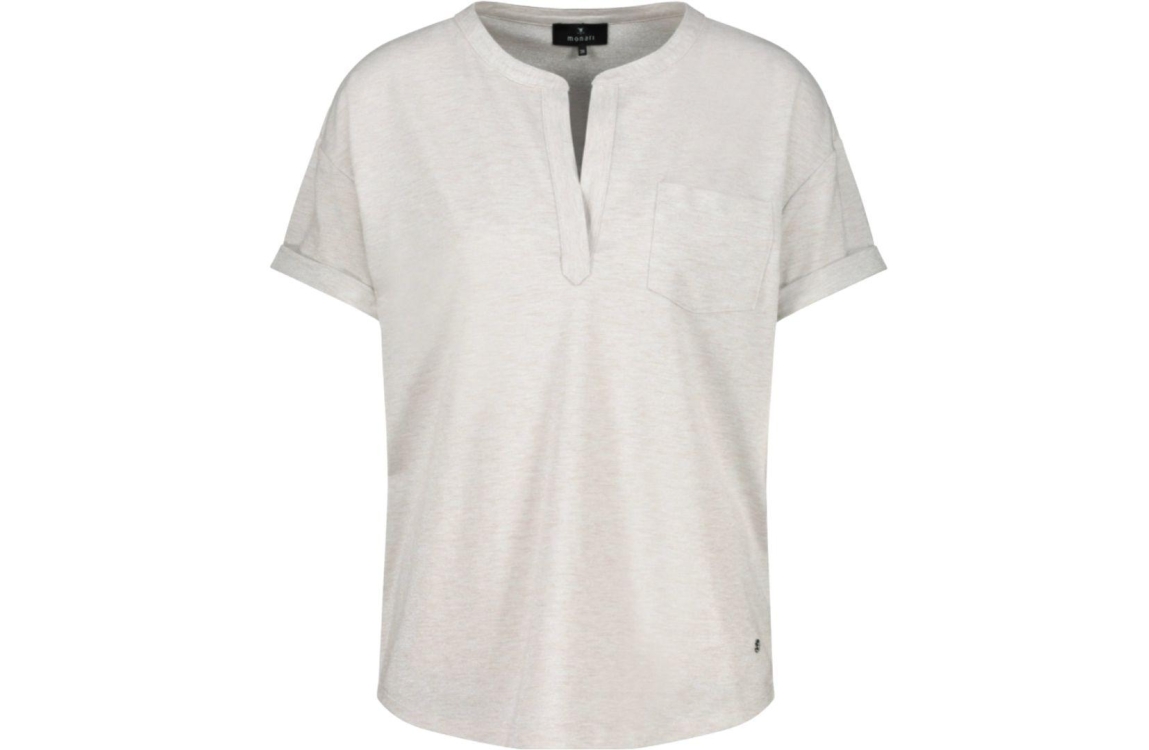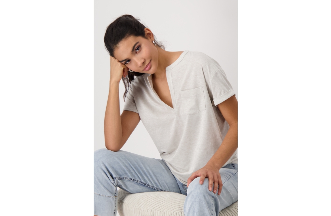 Monari T-shirt 409365 118. Dit rechtvallend model heeft een V-hals en korte mouwen. Deze grijze T-shirt van Monari is all-over bewerkt met glitterlurex en heeft een opgestikte zak op de linkerborst.