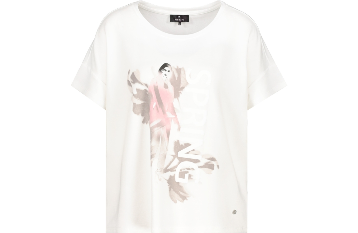 Monari T-shirt 408169. Dit rechtvallend model is voorzien van een ronde hals en heeft korte mouwen. Deze witte T-shirt van Monariis bewerkt met een roze/bruine opdruk op de voorzijde.