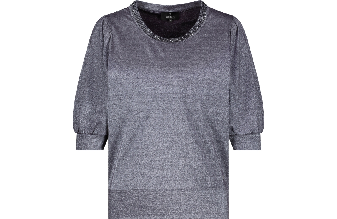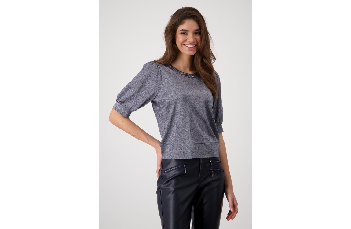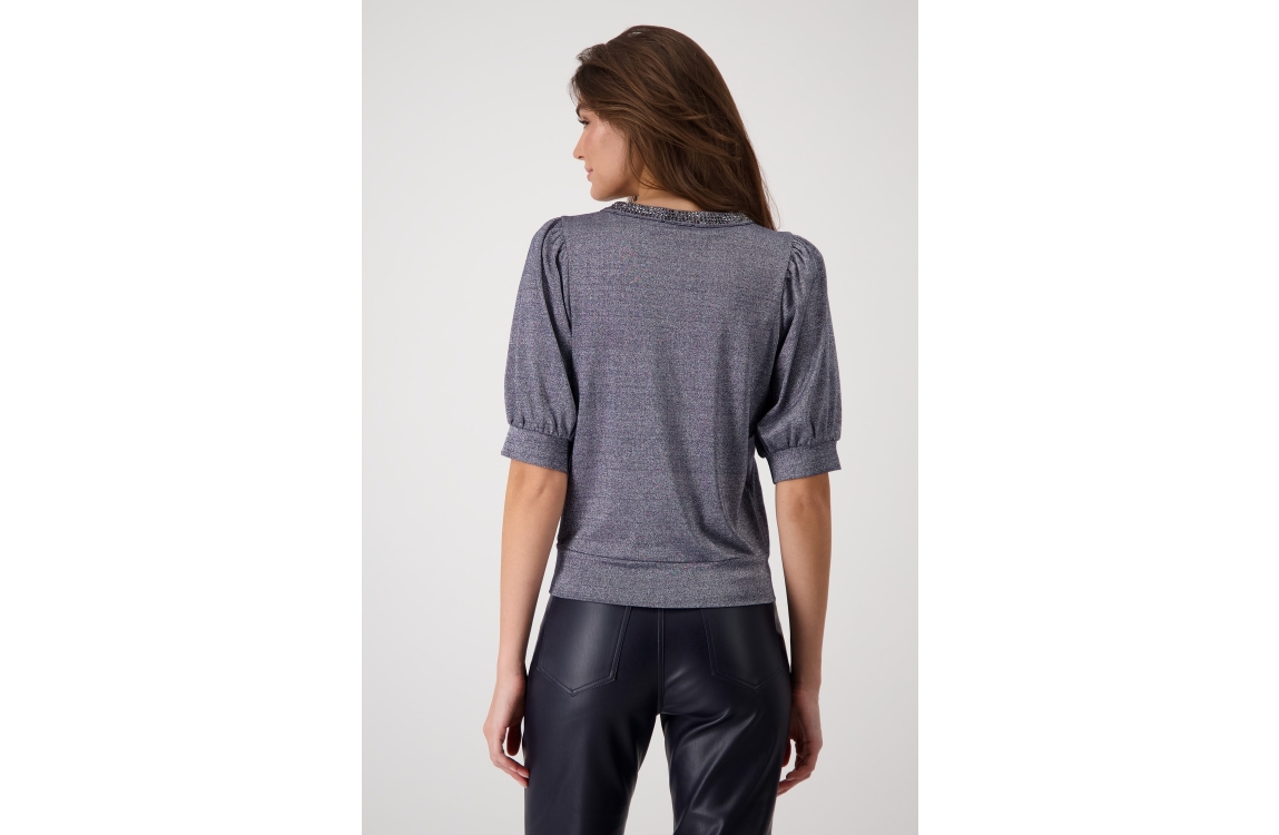 Monari T-shirt 409080. Dit rechtvallende model is voorzien van een ronde hals en heeft korte pofmouwen. Deze donker blauwe top van Monari is bewerkt met een all-over glitter en heeft strass steentjes rond de hals.