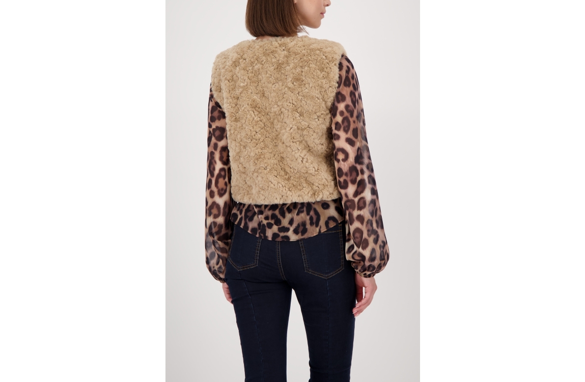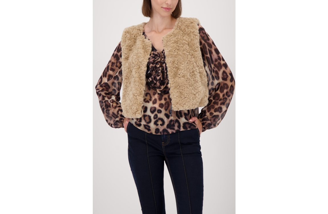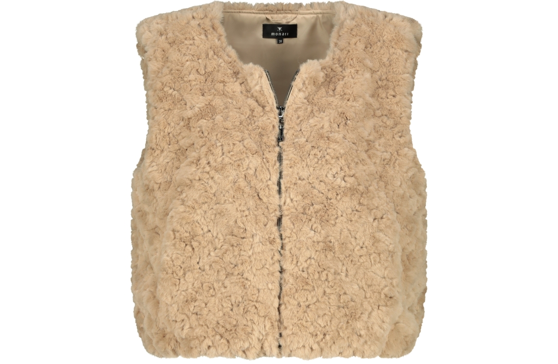 Monari gilet 809163. Dit rechtvallende model heeft een ronde halslijn en is mouwloos. Deze beige (cinnamon) gilet van Monari sluit aan de voorzijde door middel van een rits en is uitgevoerd in een bontlook.