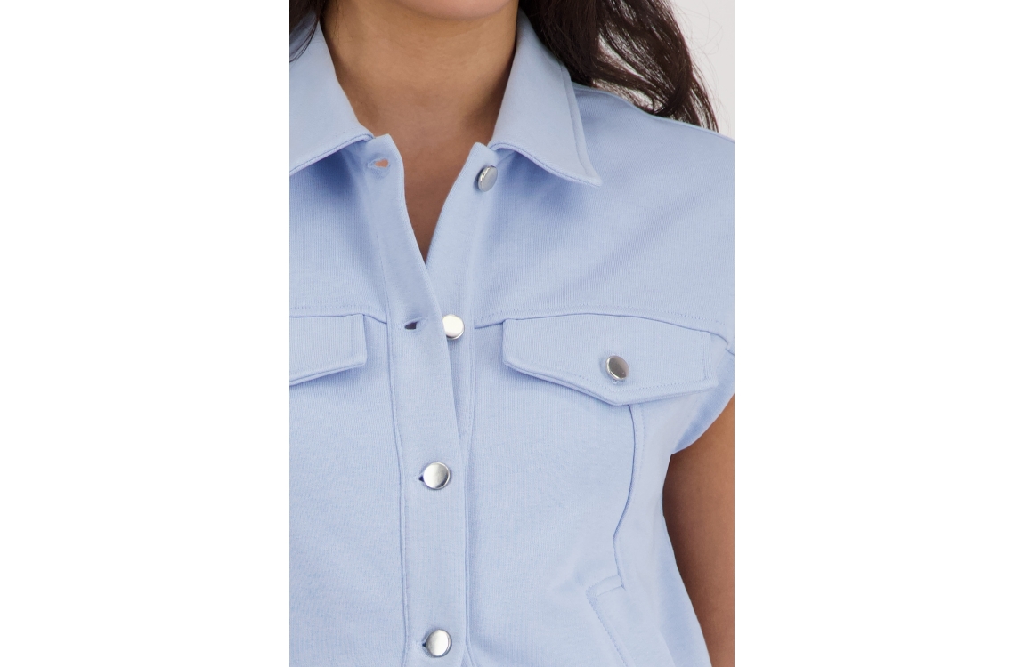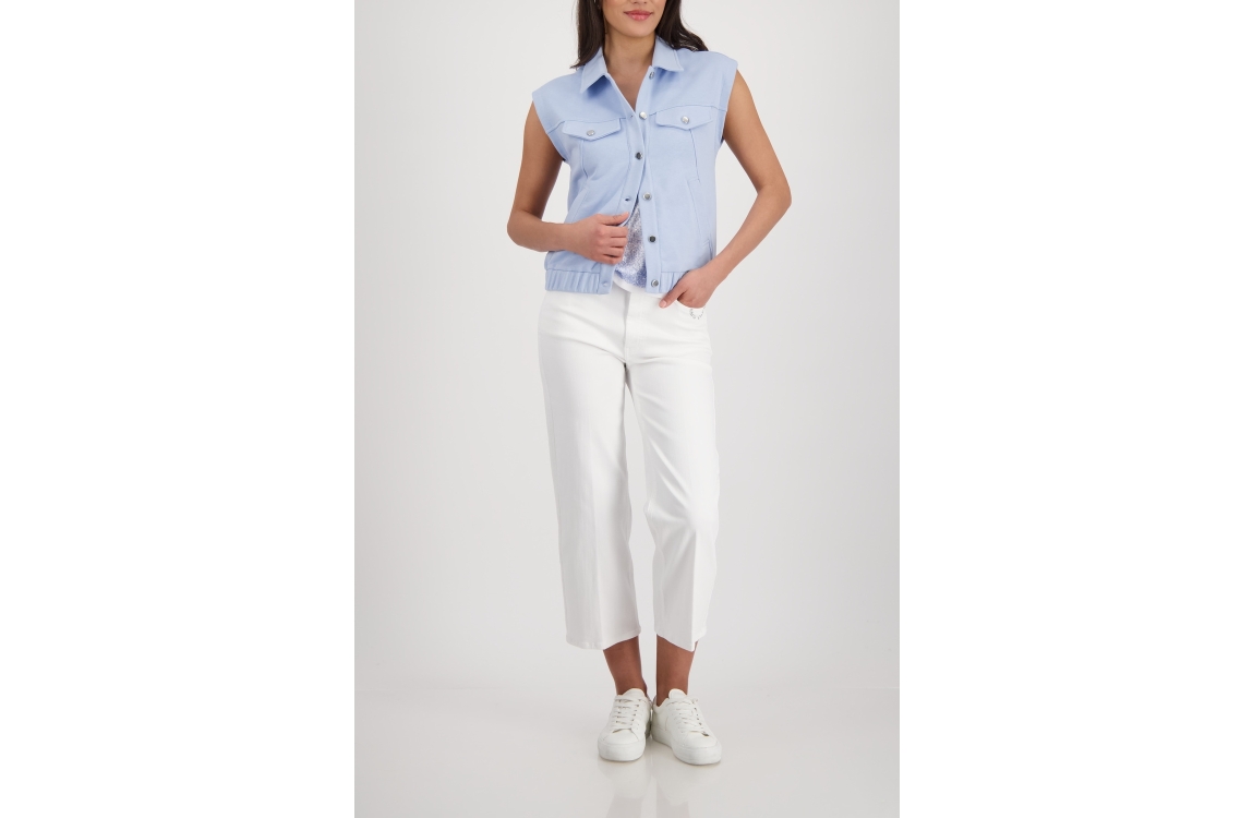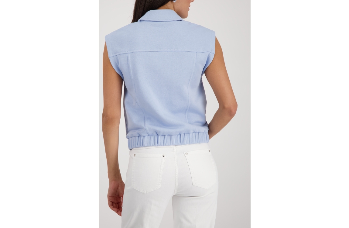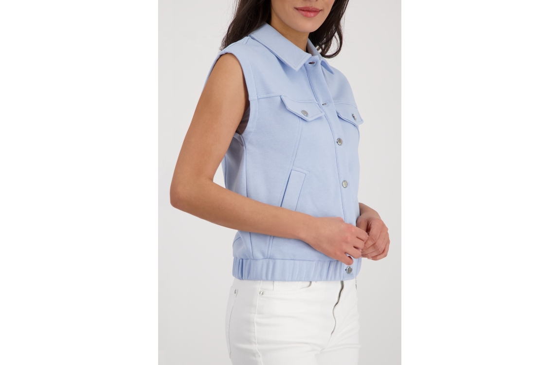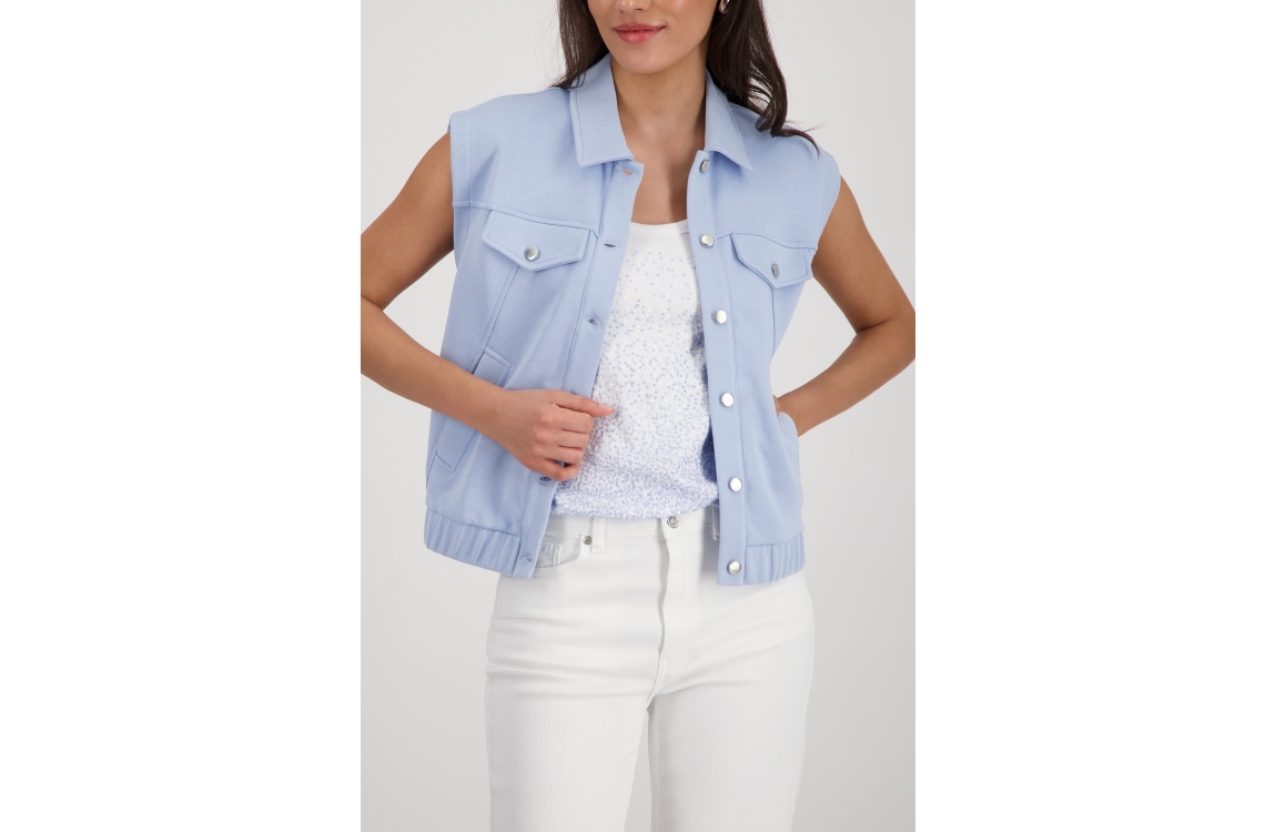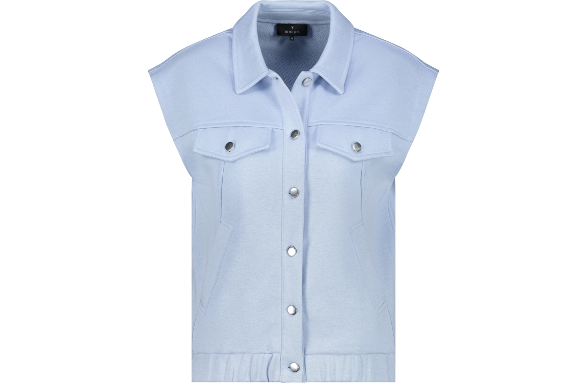 Monari vest 410642 721. Dit rechtvallende model heeft een kraag en is mouwloos. Deze lichtblauwe vest van Monari sluit door middel van knopen en is voorzien van twee steekzakken. Het model is gedetailleerd met twee decoratieve borstzakken en heeft een elastische zoom.