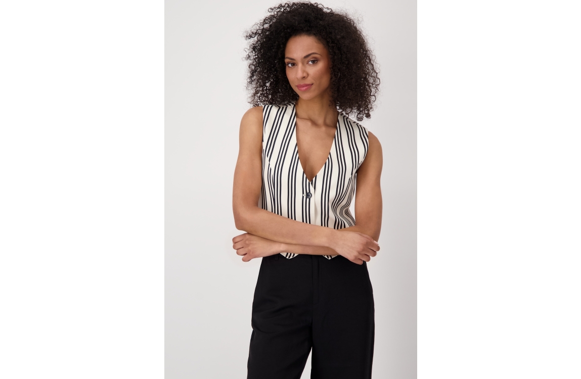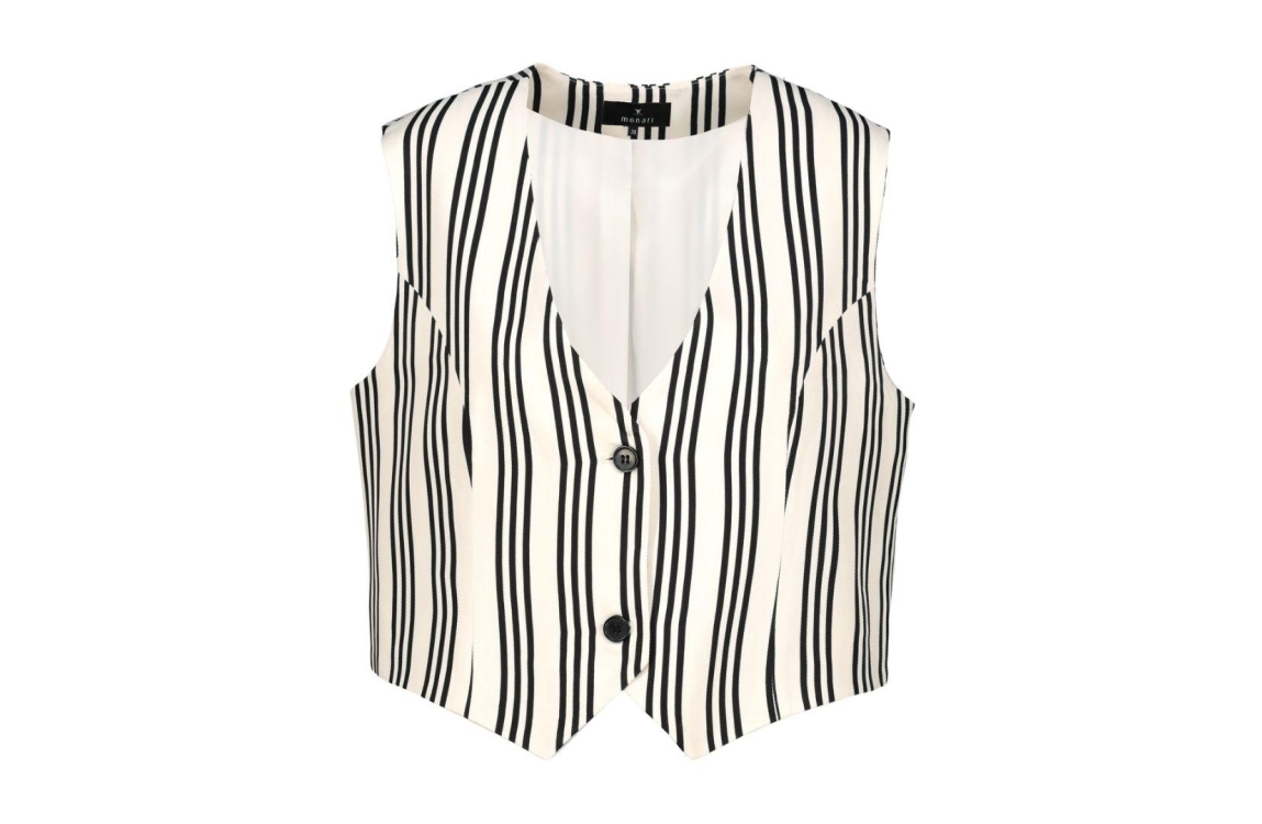 Monari gilet 409600 998. Dit rechtvallend model heeft een V-hals en is mouwloos. Deze off-white gestreepte gilet van Monari sluit aan de voorzijde door middel van knopen en is all-over bewerkt met een streeppatroon.