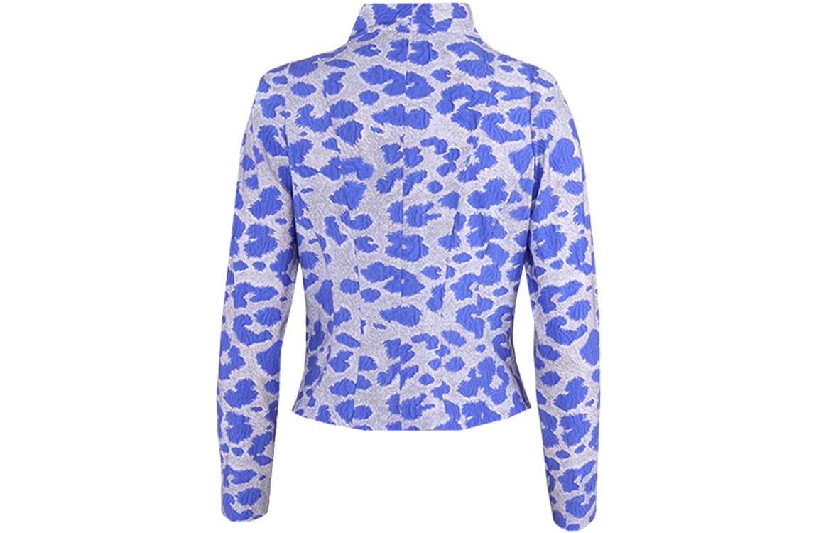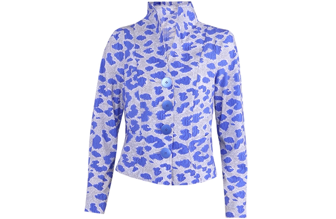 MOQ blazer Mare-0089-70. Dit aangesloten model heeft een reverskraag en lange mouwen. Deze kobalt blauwe blazer van MOQ is aan de voorzijde voorzien van twee opgestikte zakken en sluit door middel van vier grote knopen. Het model is uitgevoerd in een travel jersey en is all-over bewerkt met een print.