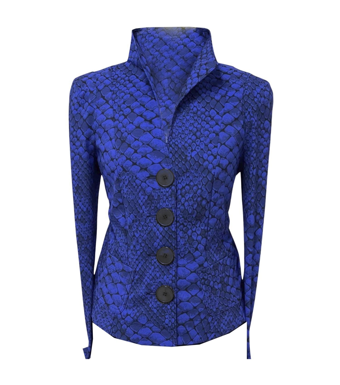 MOQ blazer Mare-N0090-70. Dit aangesloten model heeft een reverskraag en lange mouwen. Deze kobalt blauwe blazer van MOQ is aan de voorzijde voorzien van twee opgestikte zakken en sluit door middel van vier grote knopen. Het model is uitgevoerd in een travel jersey en is all-over bewerkt met een slangenprint.