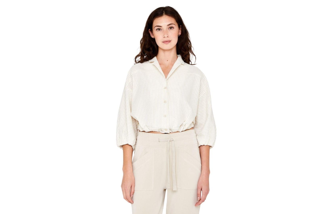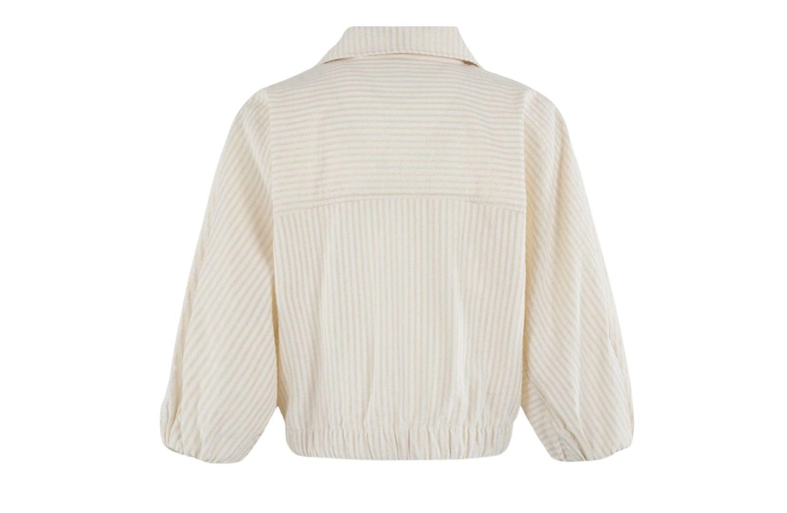 Moscow blouse 111-05-mosi. Dit model is voorzien van een kraag en heeft halflange mouwen met een elastische boord onderaan de mouw. Deze goud gestreepte blouse van Moscow sluit door middel van knopen en heeft een trekkoord onderaan de blouse, zo kun je de blouse naar wens aanpassen.
