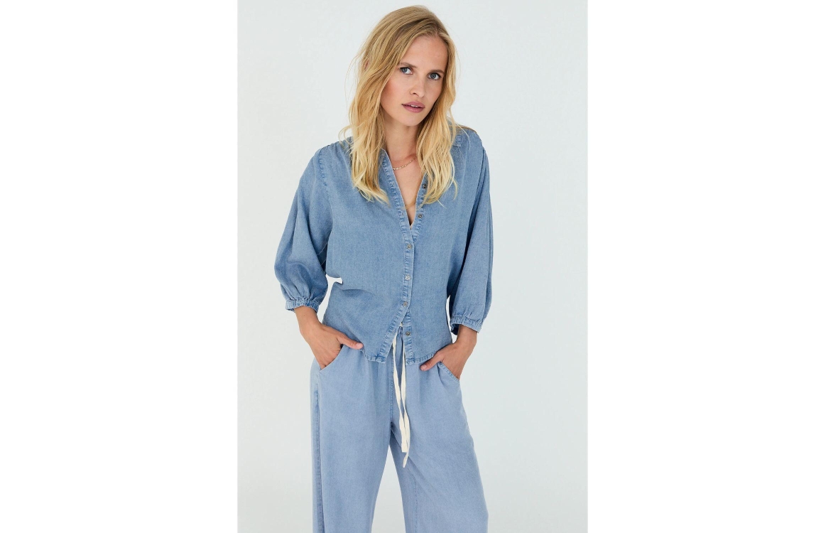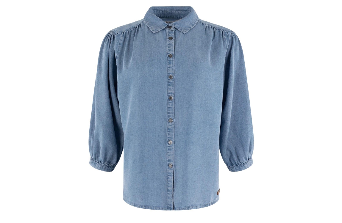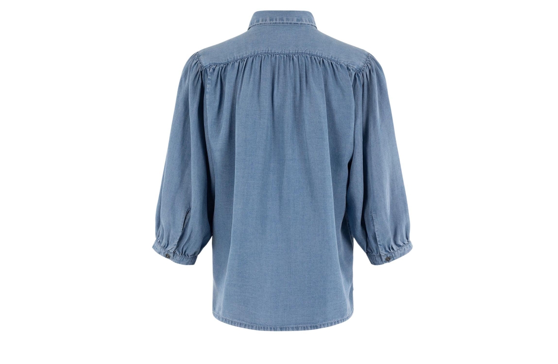 Moscow 119-05-Jorn-1 210-1Denim solid. Dit rechtvallende model is voorzien van een kraag en heeft driekwart pofmouwen. Deze denim blouse van Moscow sluit door middel van knopen en is afgewerkt met plooien op schouder en achterzijde.