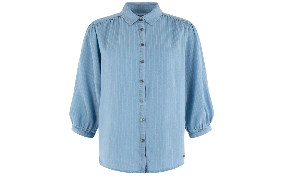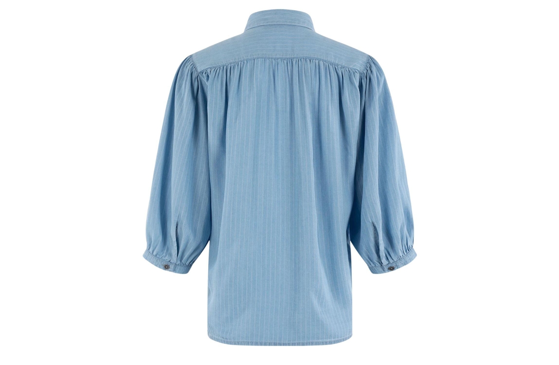 Moscow 119A-05-Jorn-1 250-3Light blue stripe. Dit rechtvallende model is voorzien van een kraag en heeft driekwart pofmouwen. Deze denim blouse van Moscow sluit door middel van knopen en is afgewerkt met plooien op schouder en achterzijde. Dit model is bewerkt met een subtiele streepprint.
