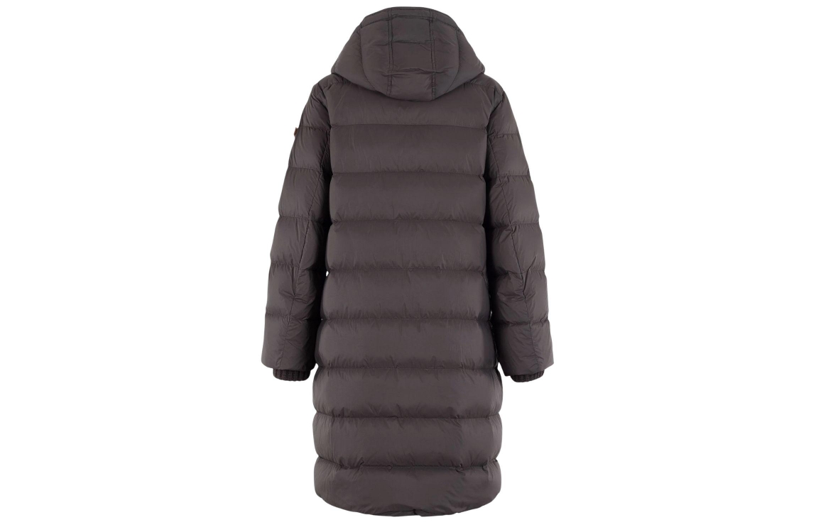Moscow jas BrandyLong 12-08 400-1. Dit regular fit model heeft een opstaande, gebreide kraag met afneembare capuchon en lange mouwen. Deze donkerbruine jas van Moscow sluit aan de voorzijde door middel van een dubbele rits- en knoopsluiting en is gewatteerd. Het model is voorzien van twee ritszakken en is afgewerkt met ribgebreide boorden.